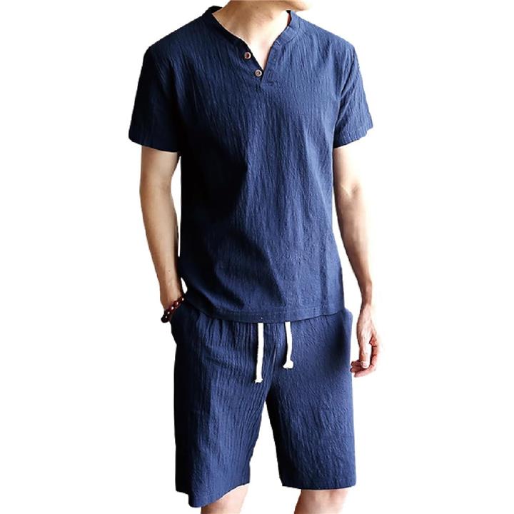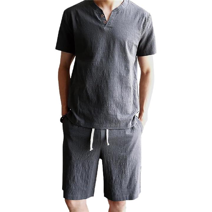 定番Vネックでお洒落に男性の定番のVネック風シャツとトレンドショートパンツのセットで、抜け感のあるデザインな。