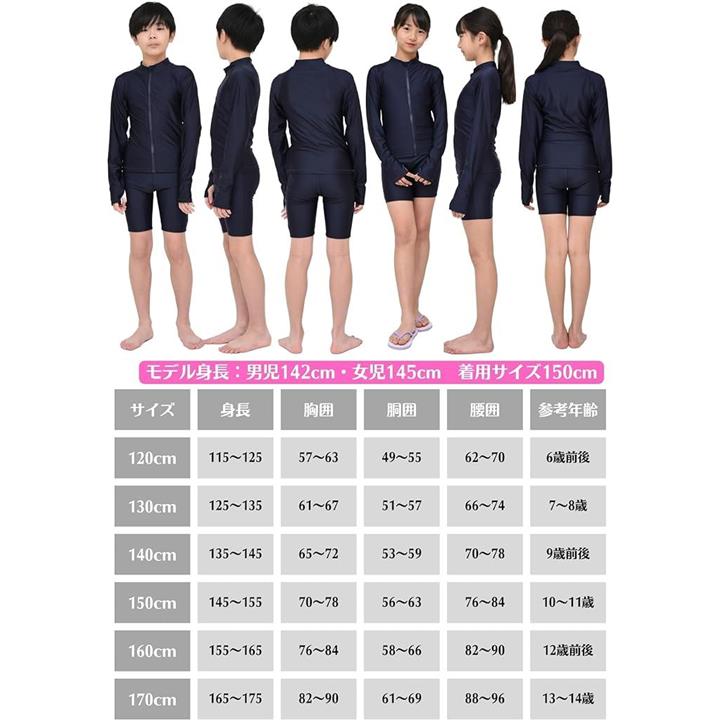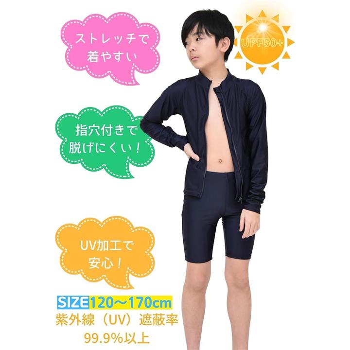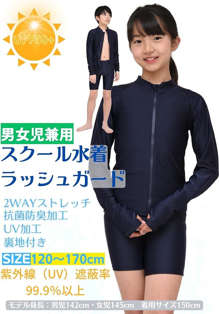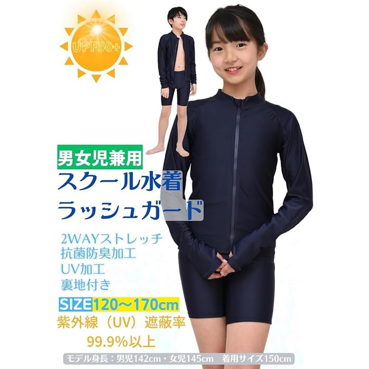 [SCHOOL HERO] スクール水着 ラッシュガード ジップアップ 男女児兼用 ファスナー キッズ 紫外線対策加工 指穴付き (150cm) |