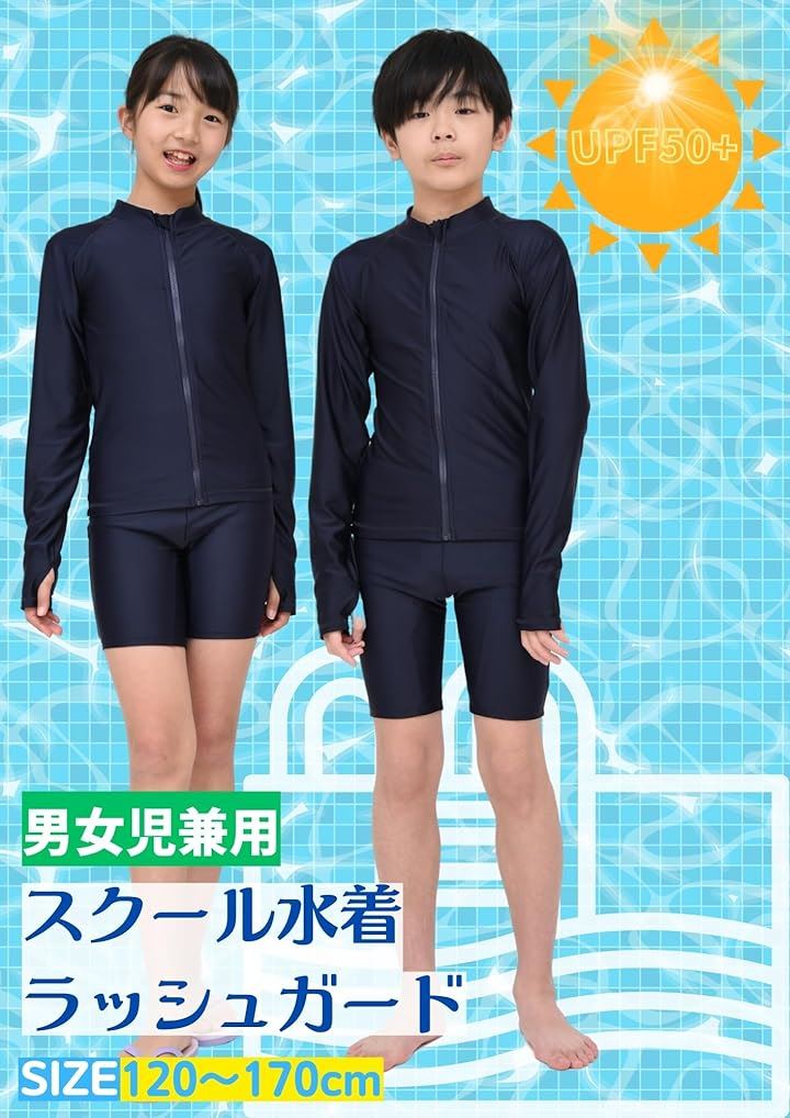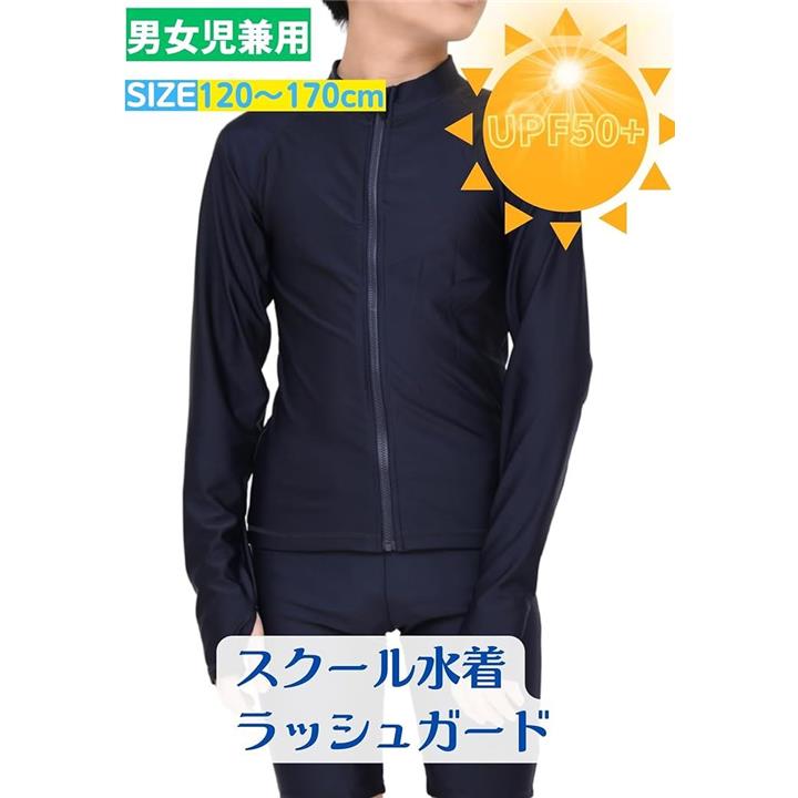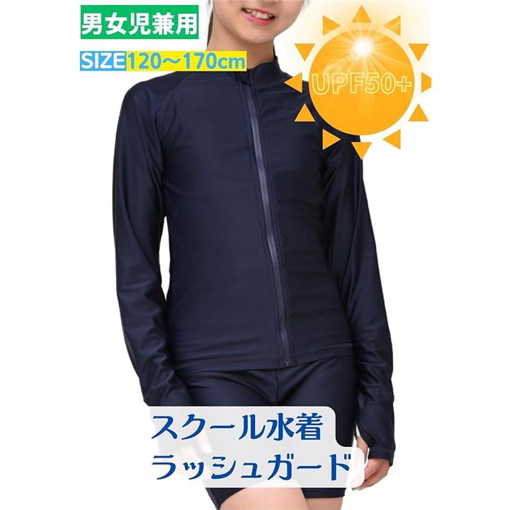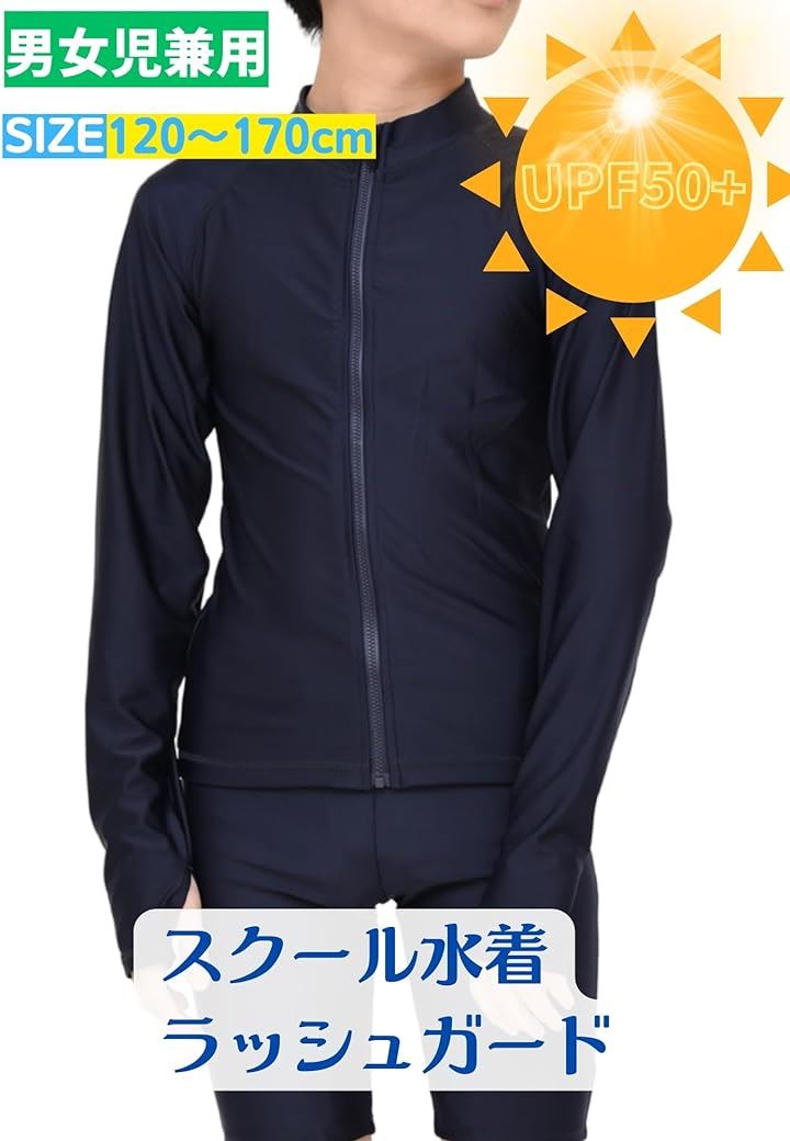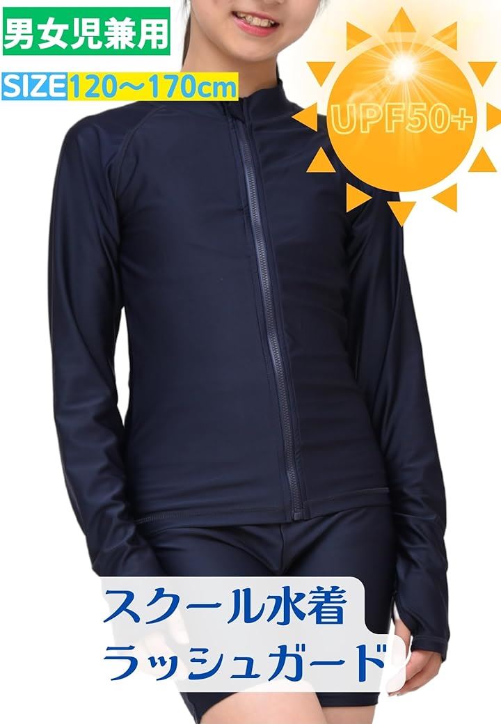 [SCHOOL HERO] スクール水着 ラッシュガード ジップアップ 男女児兼用 ファスナー キッズ 紫外線対策加工 指穴付き (120cm) |