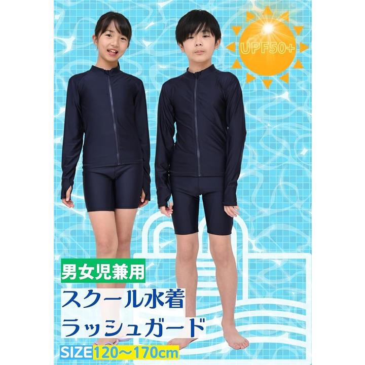 [SCHOOL HERO] スクール水着 ラッシュガード ジップアップ 男女児兼用 ファスナー キッズ 紫外線対策加工 指穴付き (170cm) |