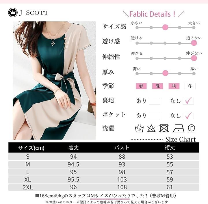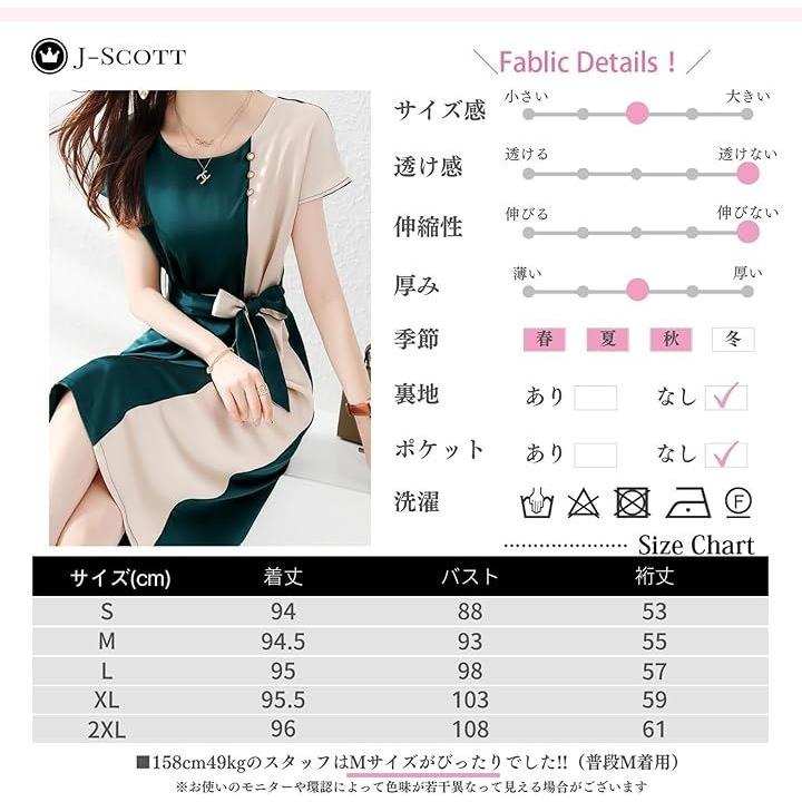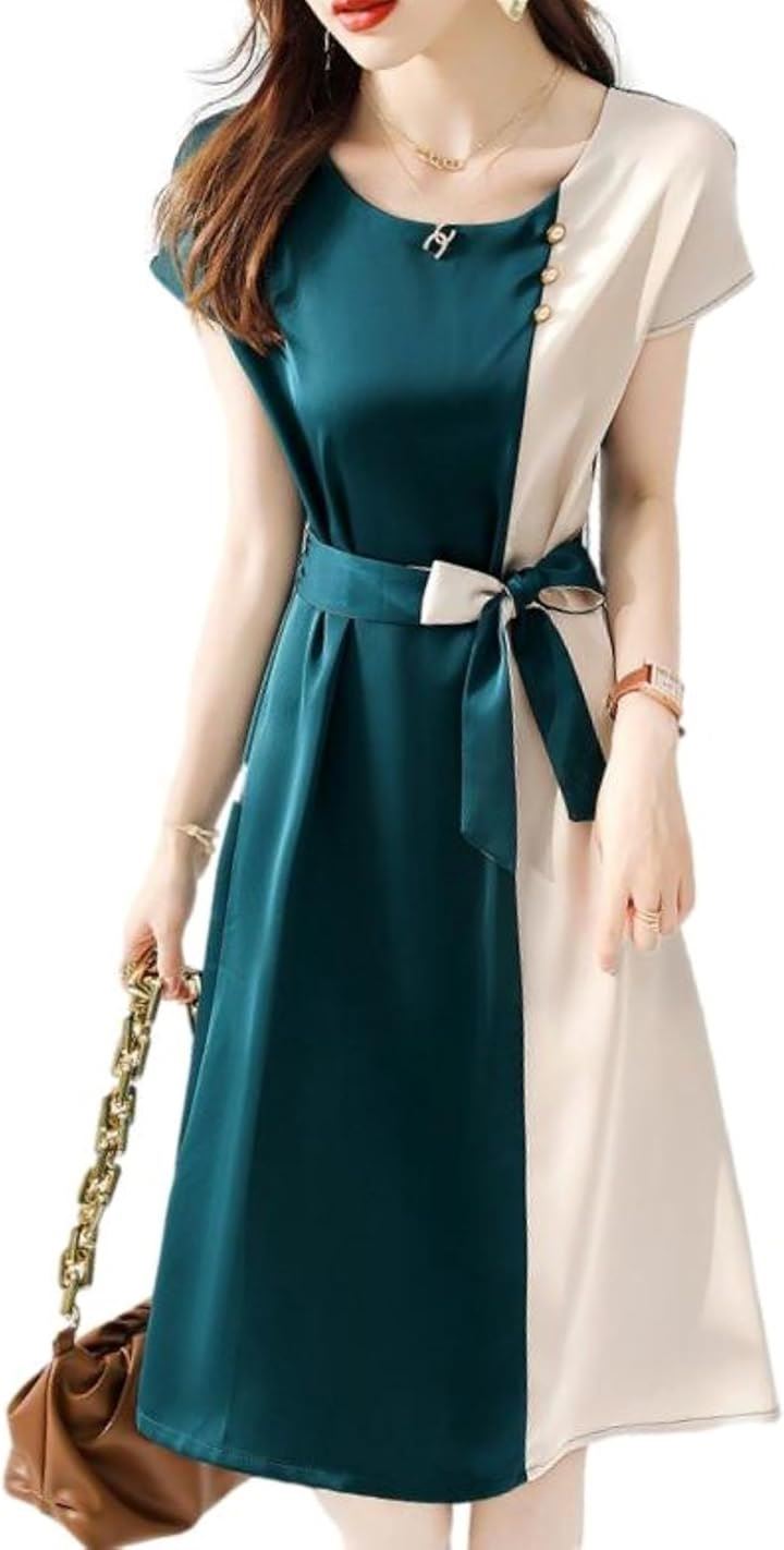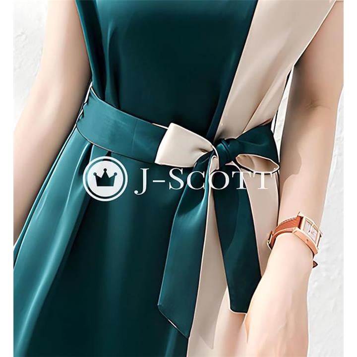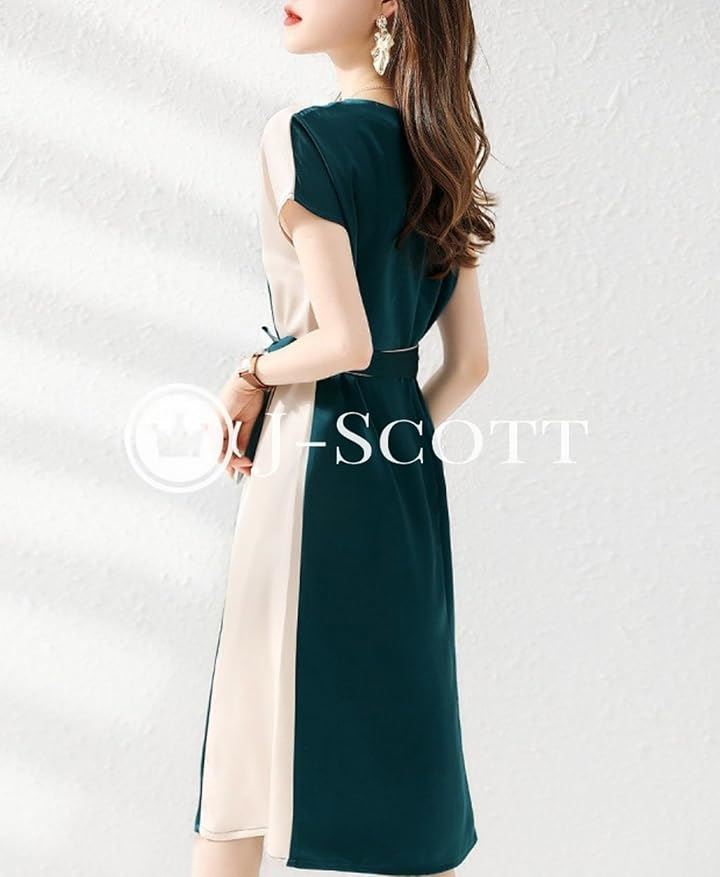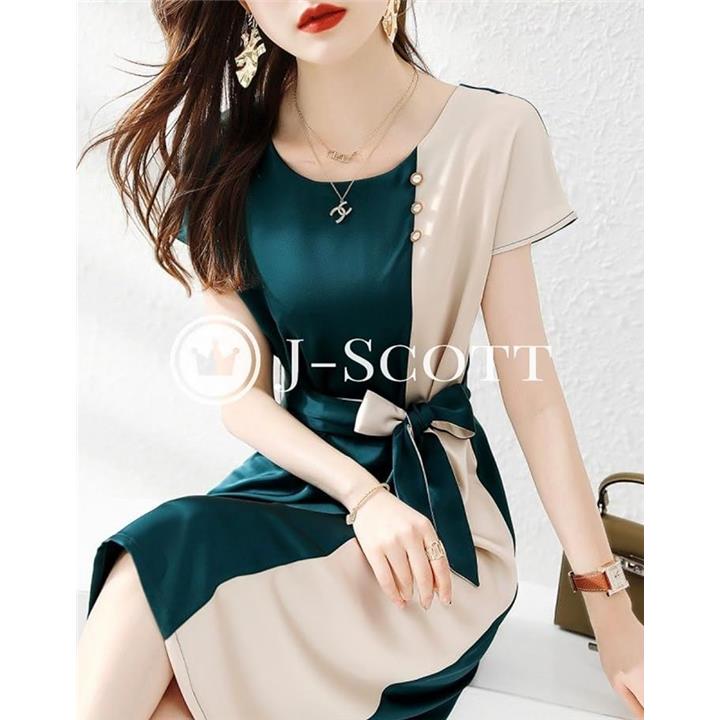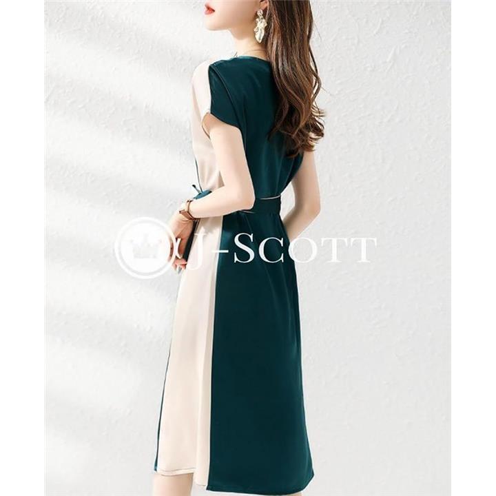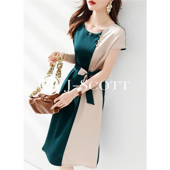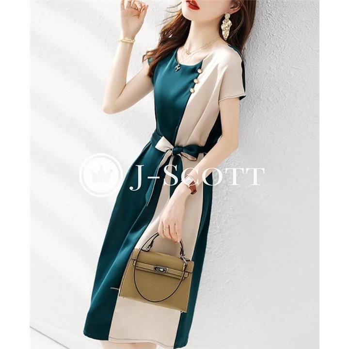 バイカラーワンピース アシンメトリー 飾りボタン フレア リボン付き ミディ丈 首元広め 半袖