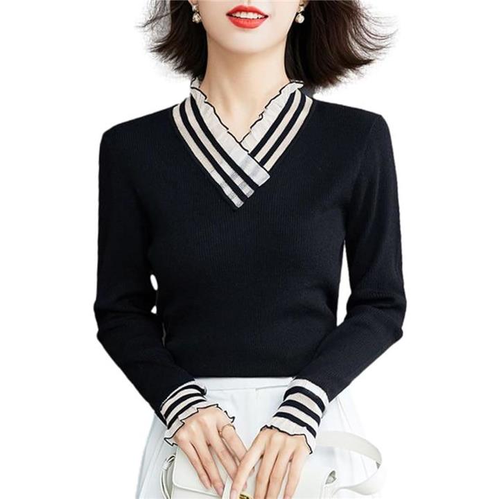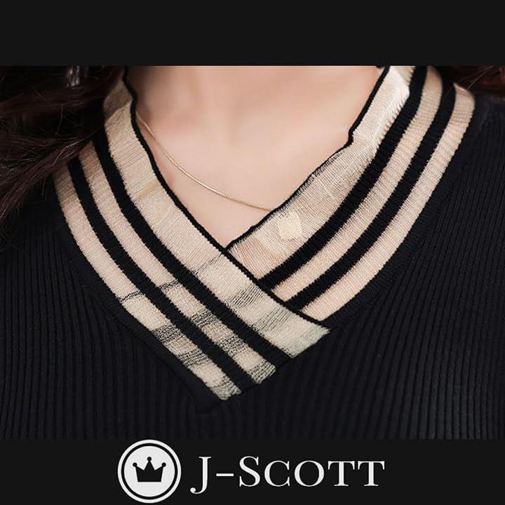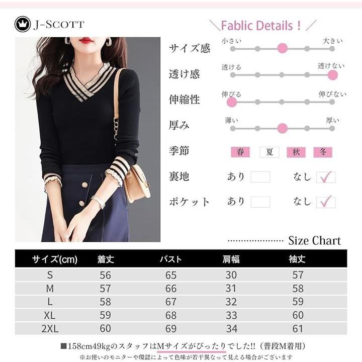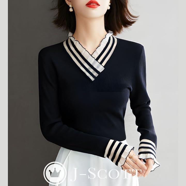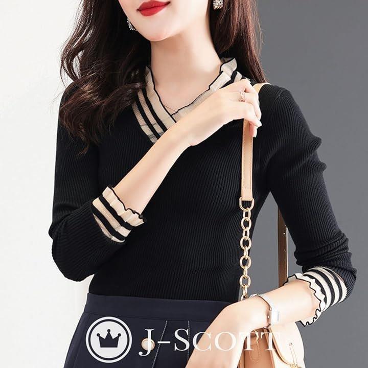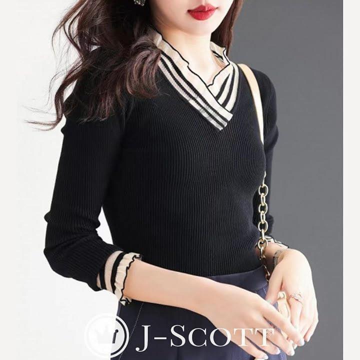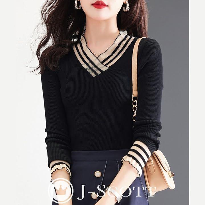 袖衿フリルリブニット シアーフリル Vネック スリムフィット ブラック
