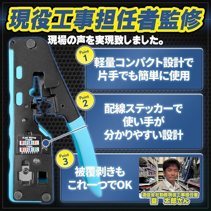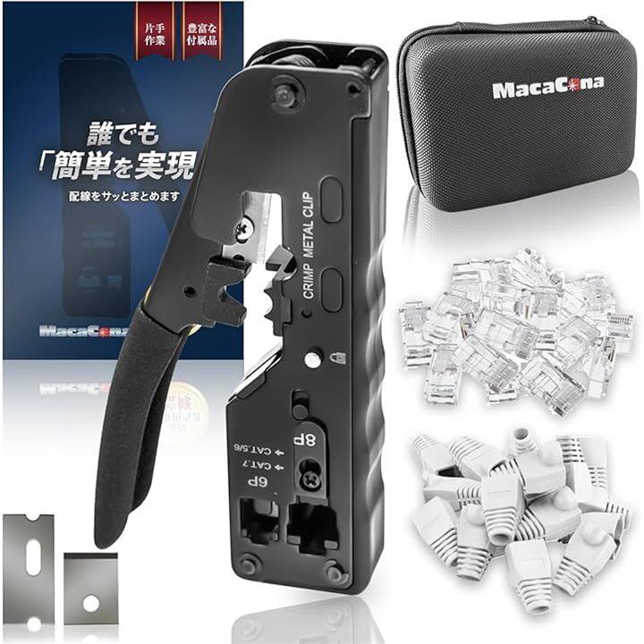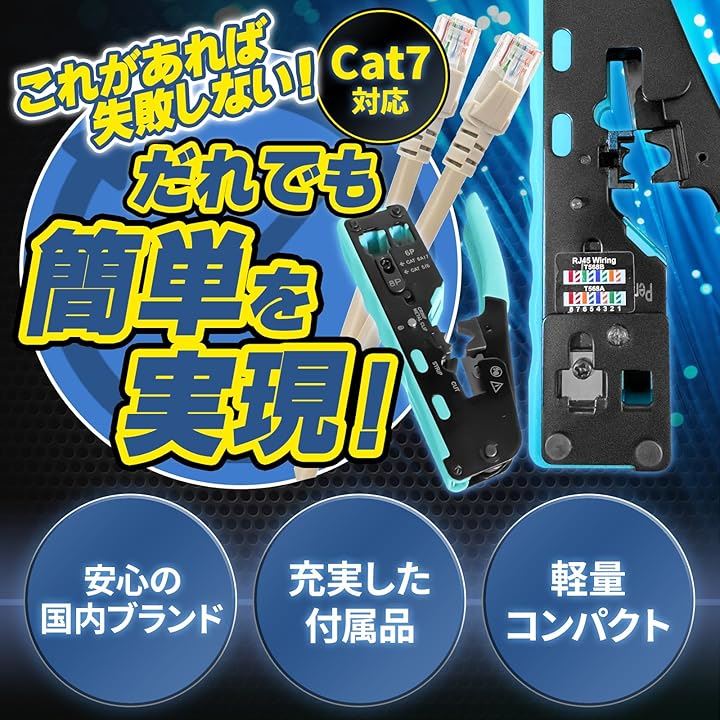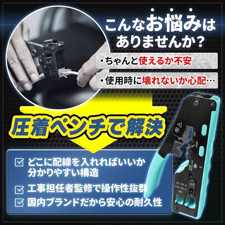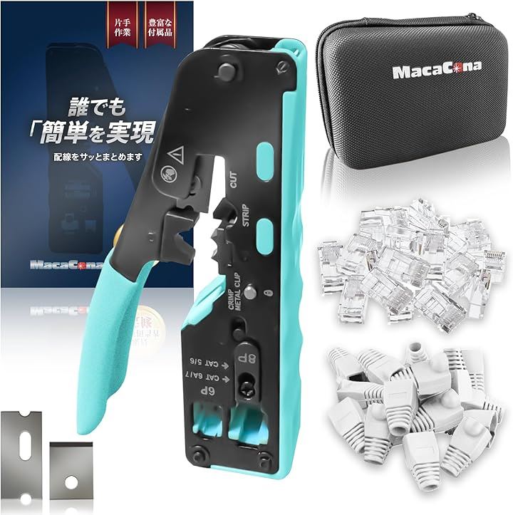 現役工事担任者監修 圧着工具 かしめペンチ LAN ケーブル製作 CAT5e/CAT6/CAT7 RJ45貫通型コネクター付属 RJ12対応 配線図 替刃付き
