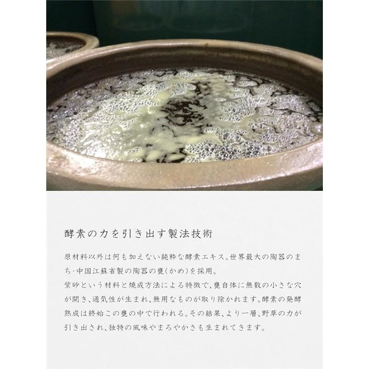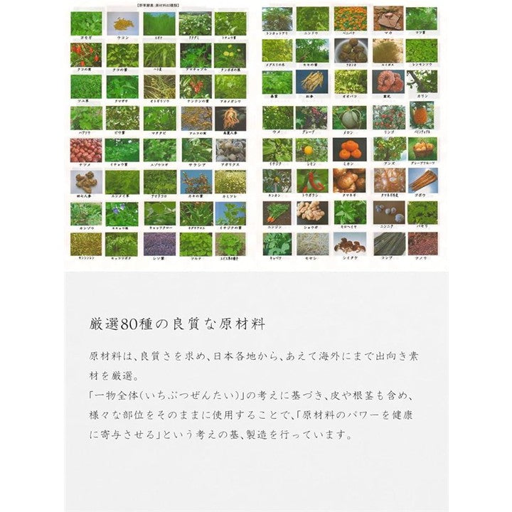加熱せずに、じっくりと手間をかけて熟成・濃縮し、酵素の力をお客様にお届けしています。 他の植物と比べ旺盛な生命力と高いエネルギーをもっている野草を中心に野菜・果物・海藻等を厳選80種をブレンドしています。