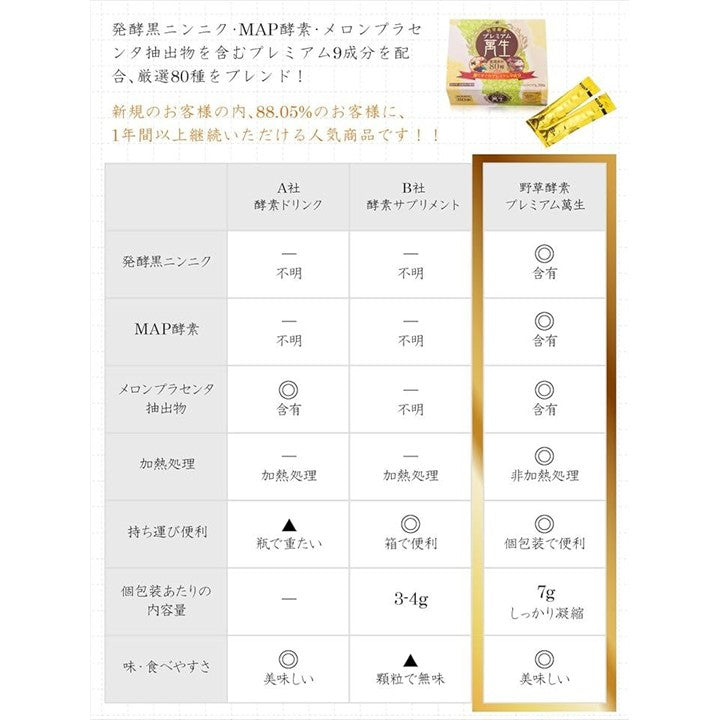 「野草酵素サプリ」 「野草56種を含む80種から濃縮した栄養素がたっぷり」 「加熱処理ではできない非加熱でしっかり濃縮」野草酵素 プレミアム 萬生 発酵黒ニンニク MAP酵素 メロンプラセンタ抽出物 野草 酵素 ペースト ファスティング 80種類 国産 日本製 |