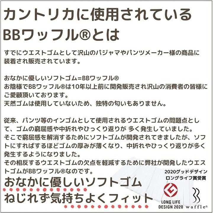 その相反するウエストゴムの欠点を軽減するために開発したウエストゴムがBBワッフルソフトタイプです。