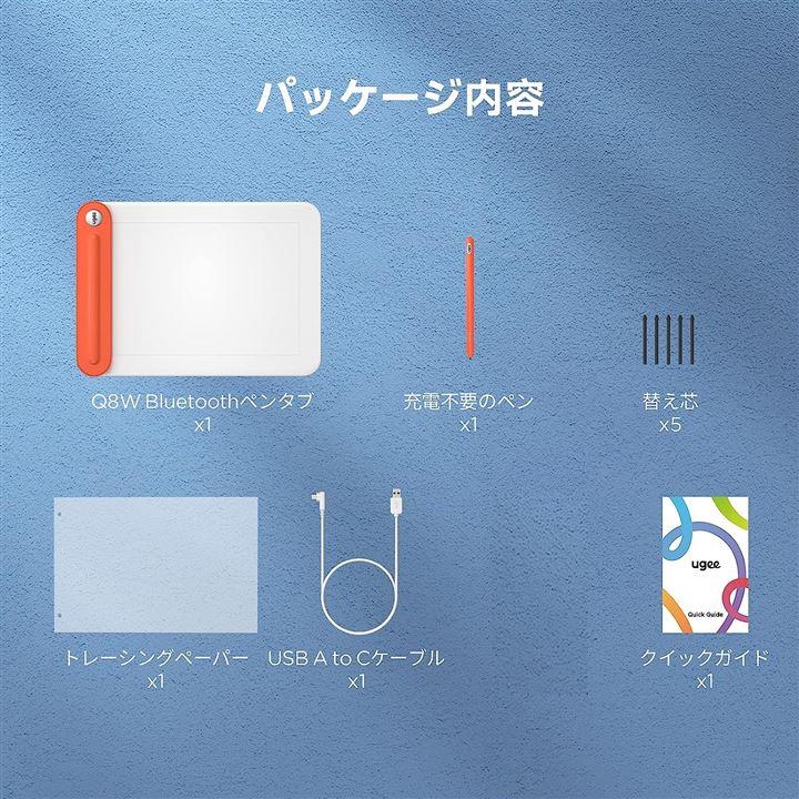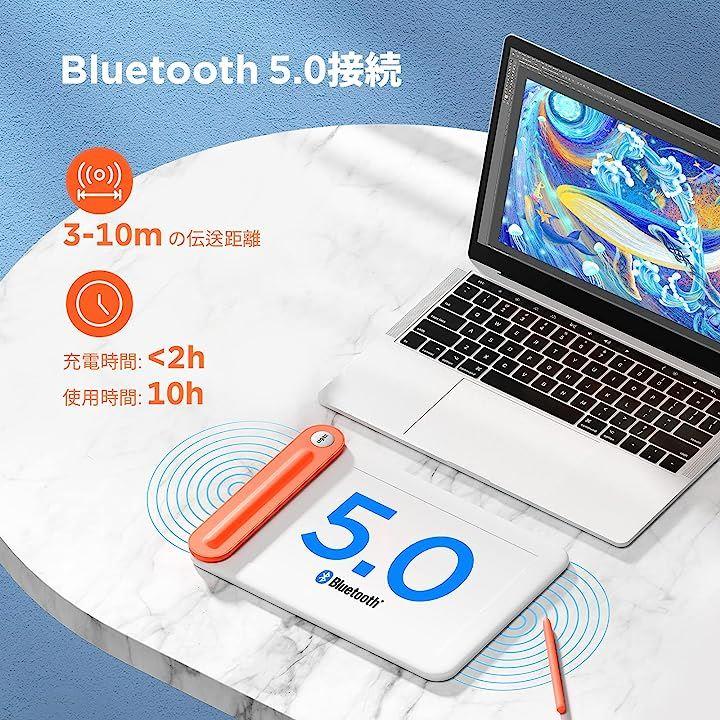 2.「Bluetooth接続」:Bluetooth v5.0チップが内蔵されているugee Q8Wペンタブレットはケーブルなしで楽に作画創作が始められ、3-10mの通信距離と高速転送を可能にします。