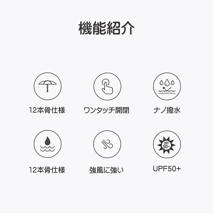 「優れた性能」 晴れた日にはUPF50+ UVカット率は99%、遮光で活躍し、雨が降っても撥水加工はもちろん、強い風にも強い12本骨を採用しています。