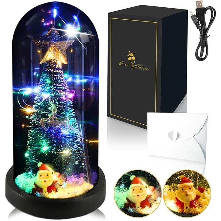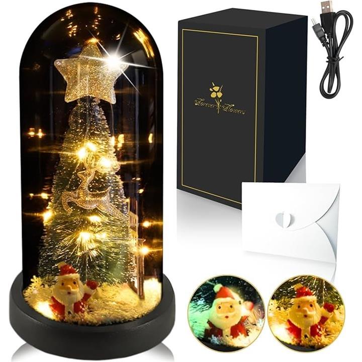クリスマスツリー 卓上 ミニ スノードーム クリスマス 枯れない花 「笑顔咲ク 光る花 」造花 バラ ForeverFlowers [クリスマス仕様オーロラライト USB電池両用] |