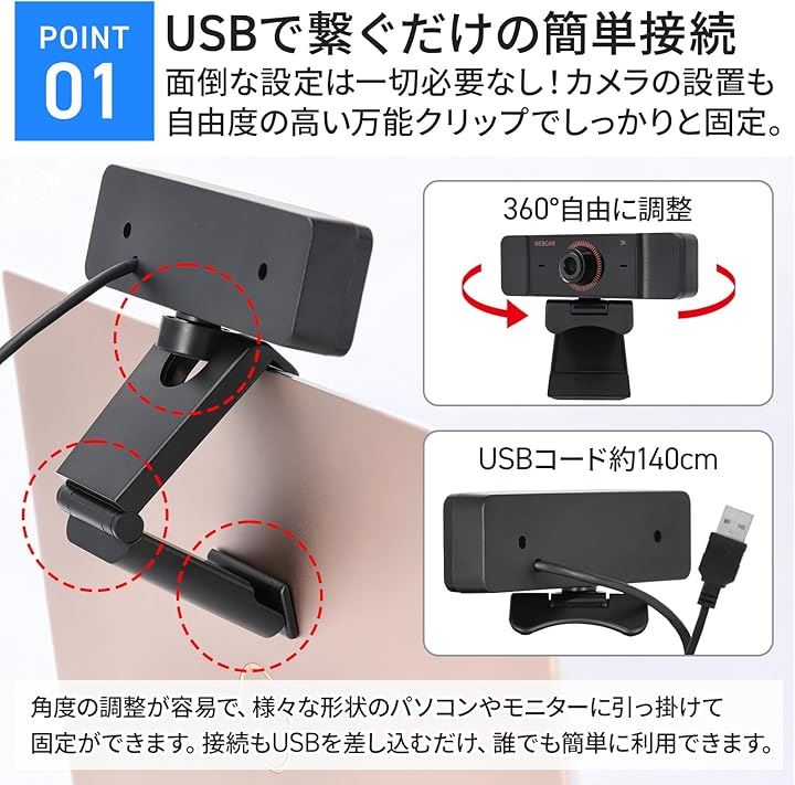 互換品2024年モデル 幅広い互換性 Webカメラ ウェブカメラ フルHD マイク内蔵 USBカメラ クリップ/スタンド式 挿すだけですぐ使える 三脚対応 外付けwebcam PCカメラ ドライバ不要 授業カメラ ブラック