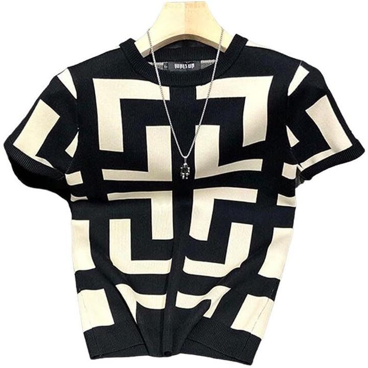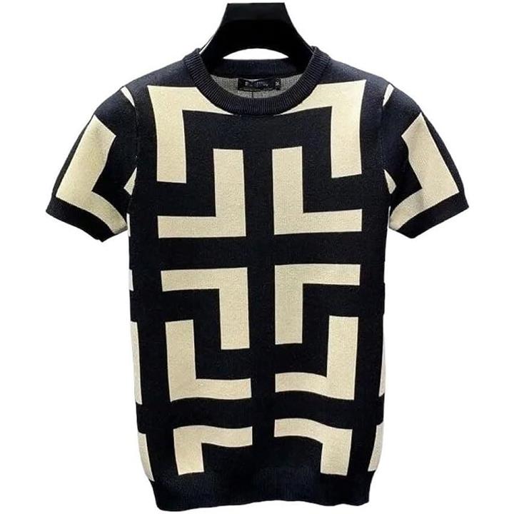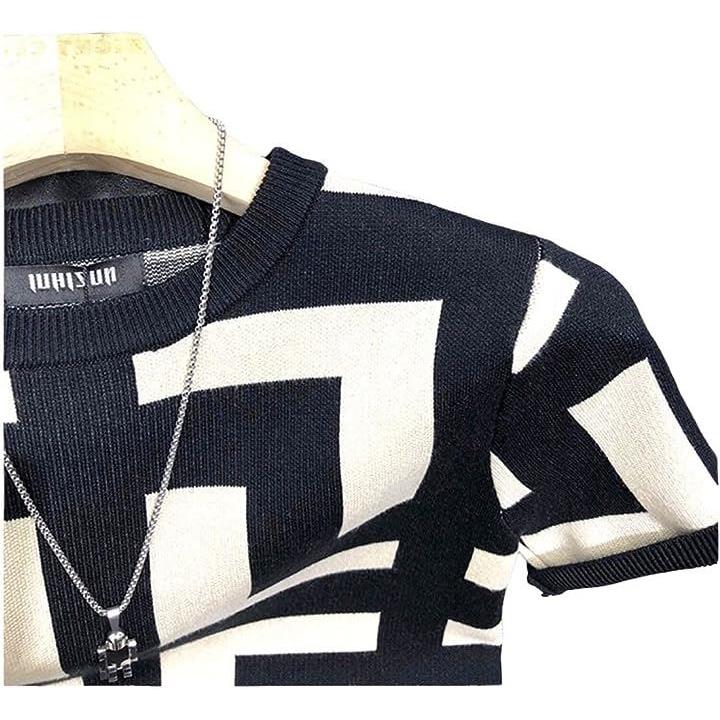 シャツ ニット サマーニット セーター メンズ 夏 春 バイカラー 幾何学 ラインデザイン チェック ブラック ホワイト