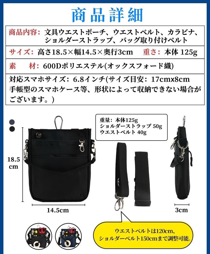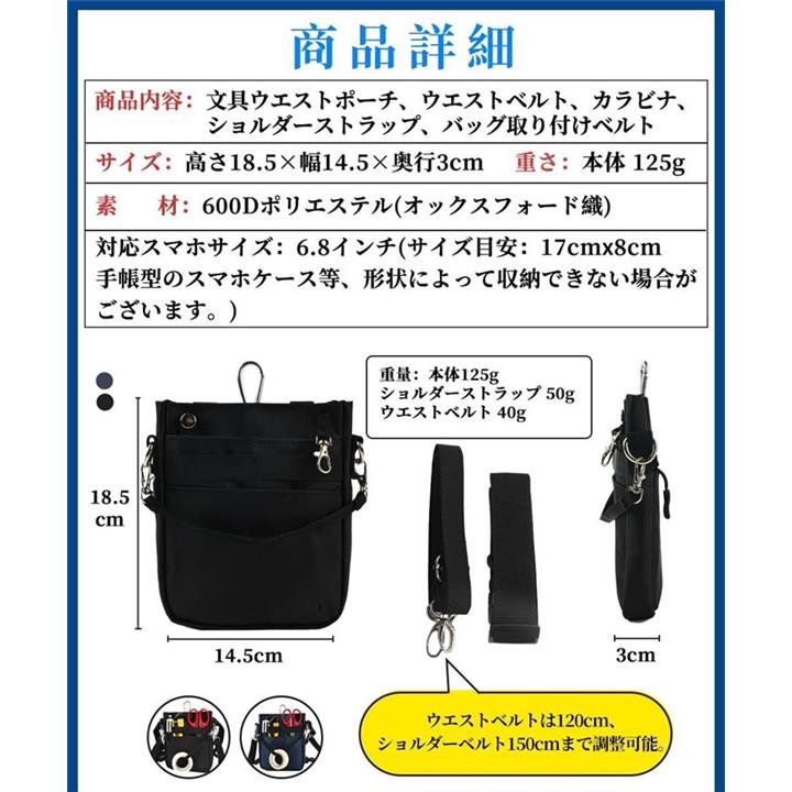 *「商品詳細」商品内容:文具ウエストポーチ、ウエストベルト、ショルダーストラップ、カラビナ、バッグ取り付けベルト サイズ:高さ18.5x幅14.5x奥行3cm 重量:本体 125g ショルダーストラップ 50g ウエストベルト 40g 素材:600Dポリエステル(オックスフォード織) ウエストベルトは120cm、ショルダーベルトは150cmまで調整可能。
