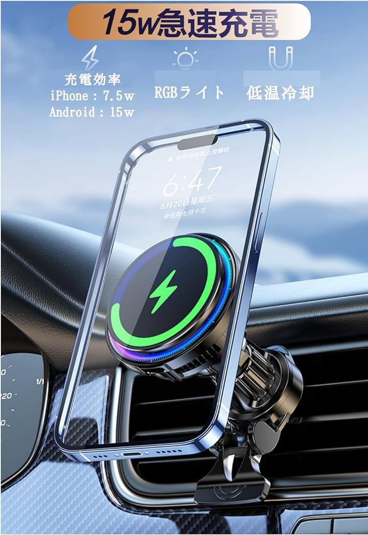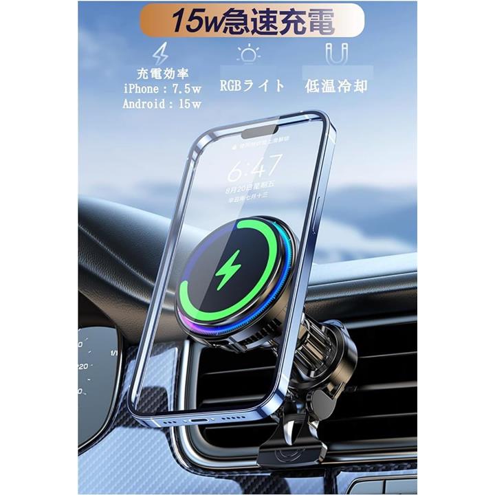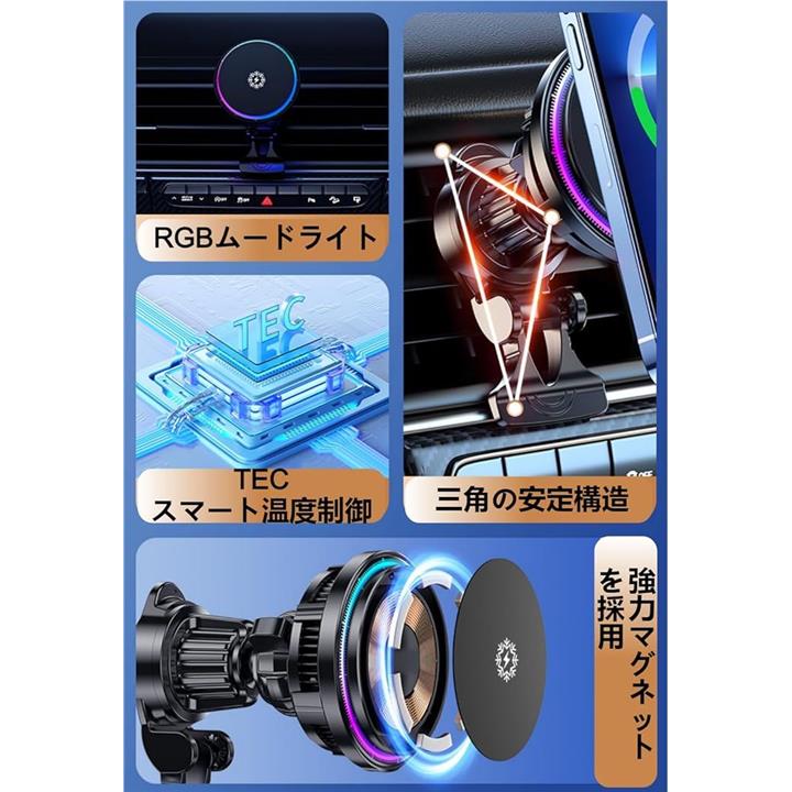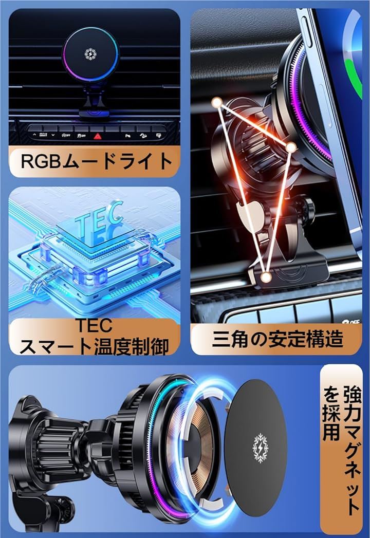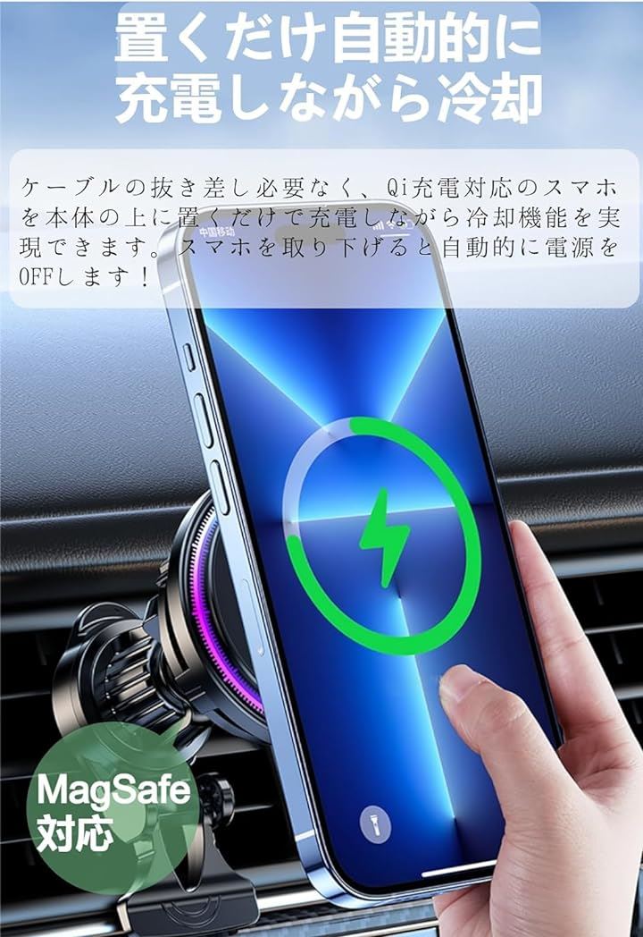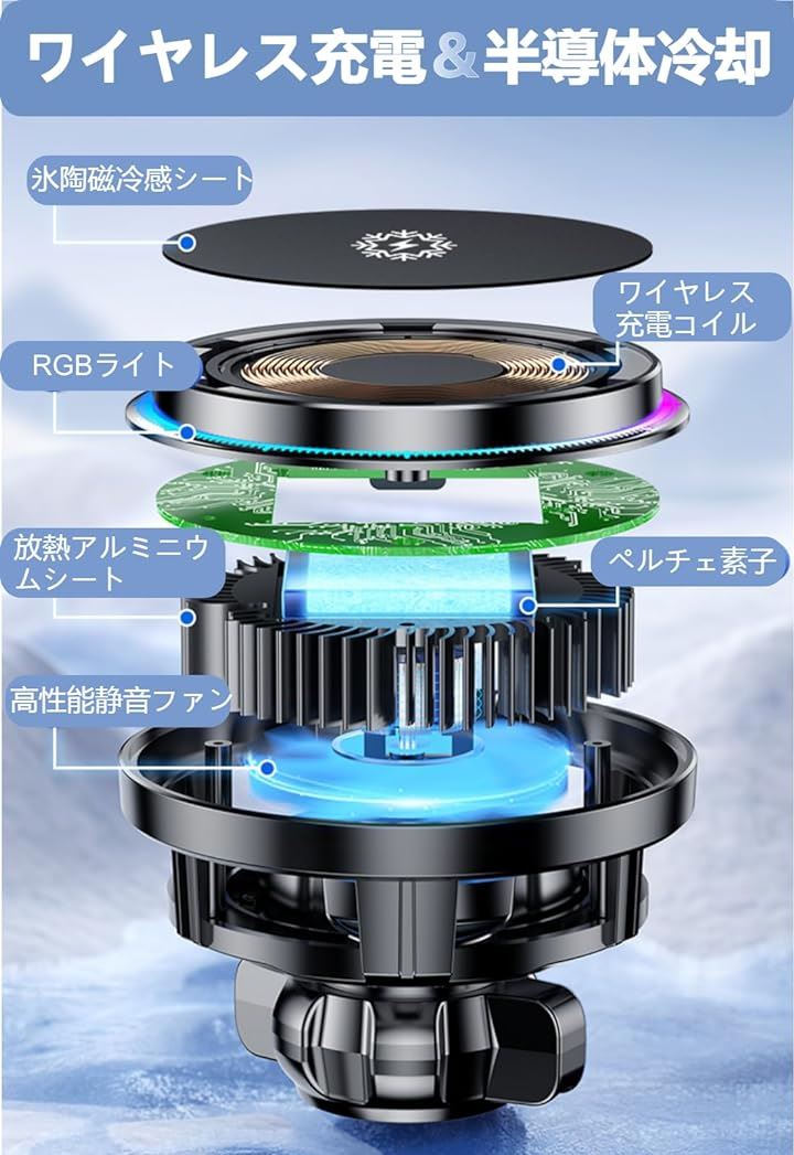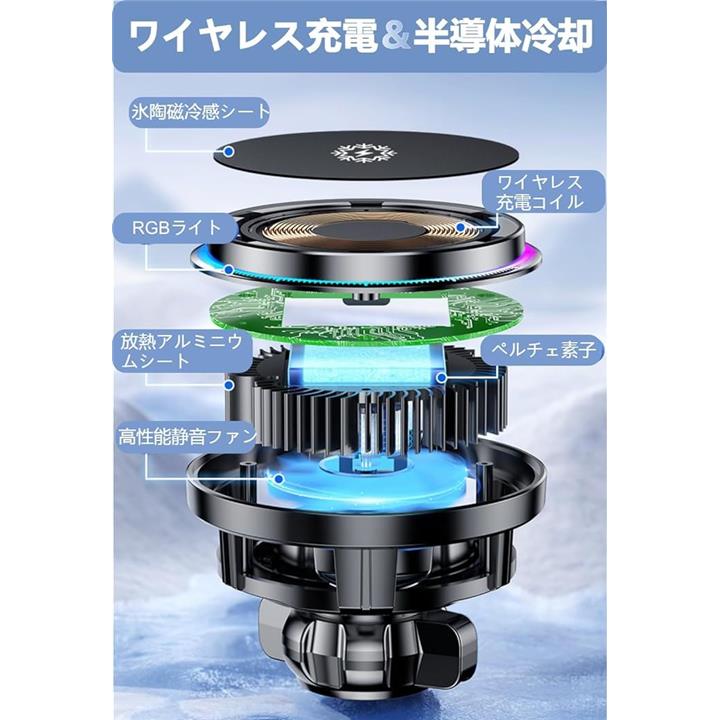 A82 スマホクーラー スマホ冷却ファン 車載用 ワイヤレス充電機能付き ペルチェ半導体冷却 磁気吸着 ボールジョイント付き iphone冷却 Qi充電機種に対応