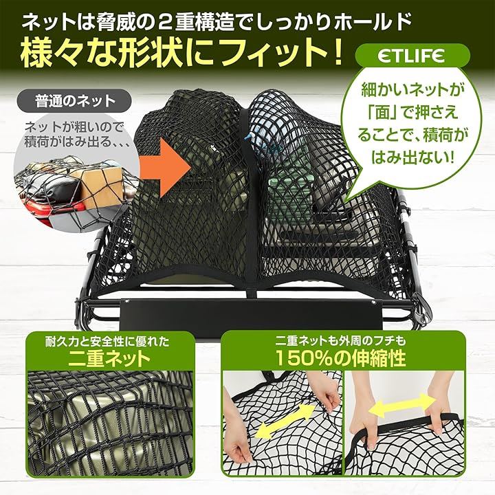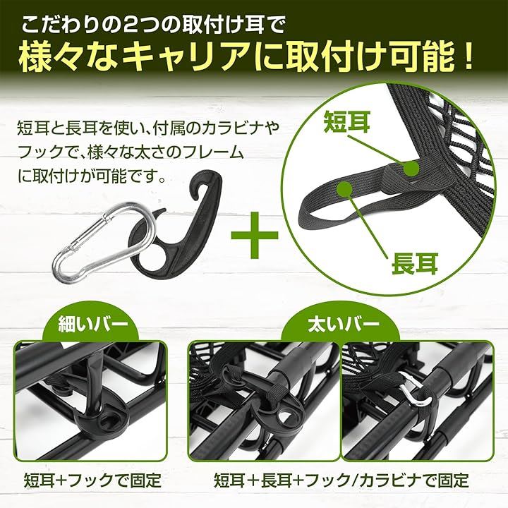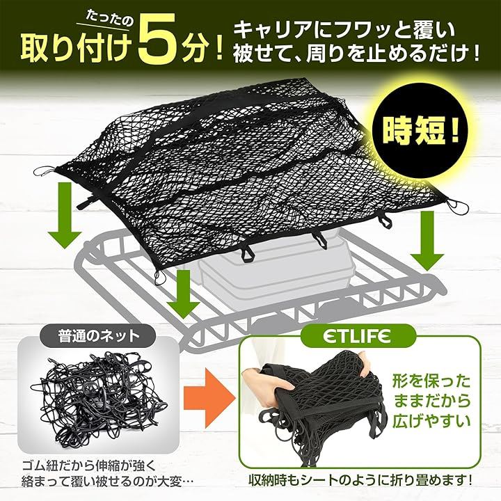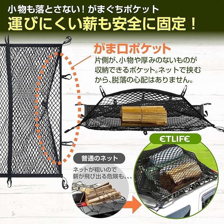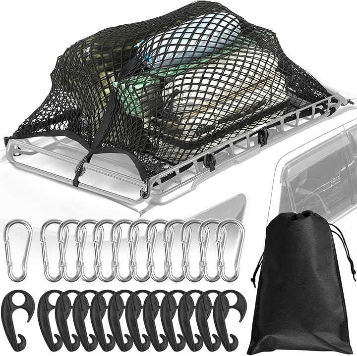 カーゴネット 車 90x120cm 2重キャンプインストラクター監修 簡単設置で時短。絡まない。ABS製フックx12 ステンレス製カラビナx12 収納ポーチ付属 ルーフラック ルーフネット ラゲッジネット ルーフキャリア 荷崩れ防止