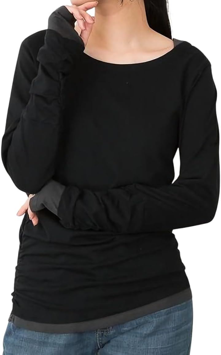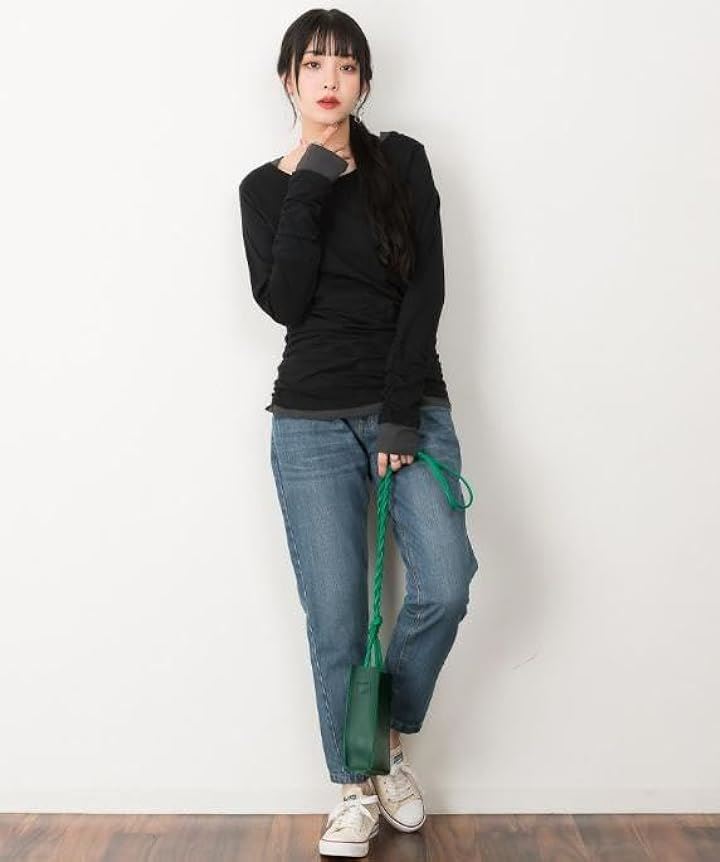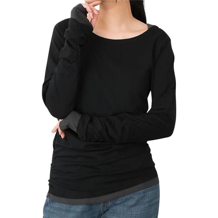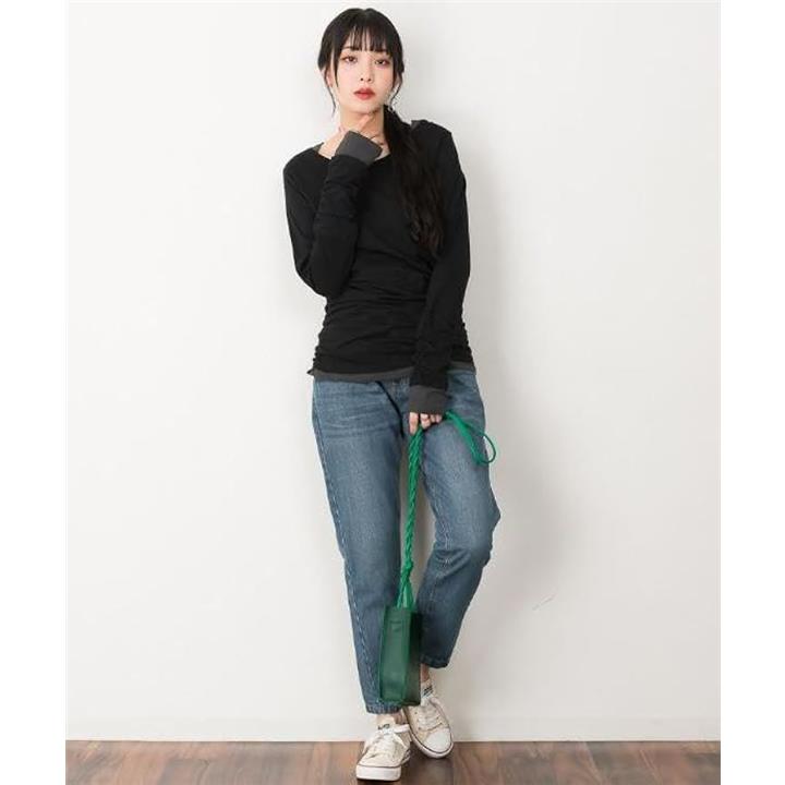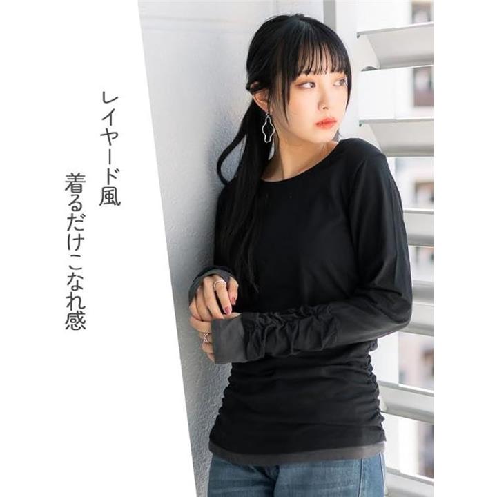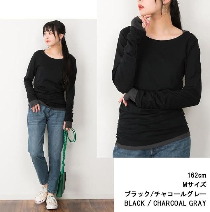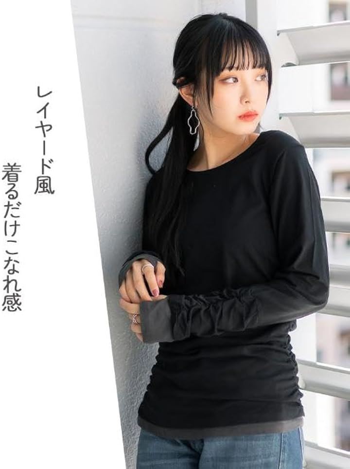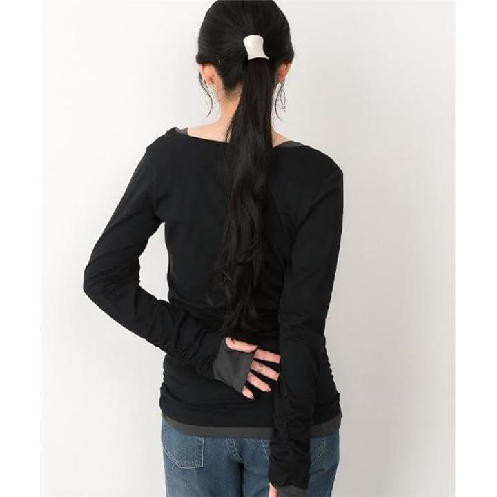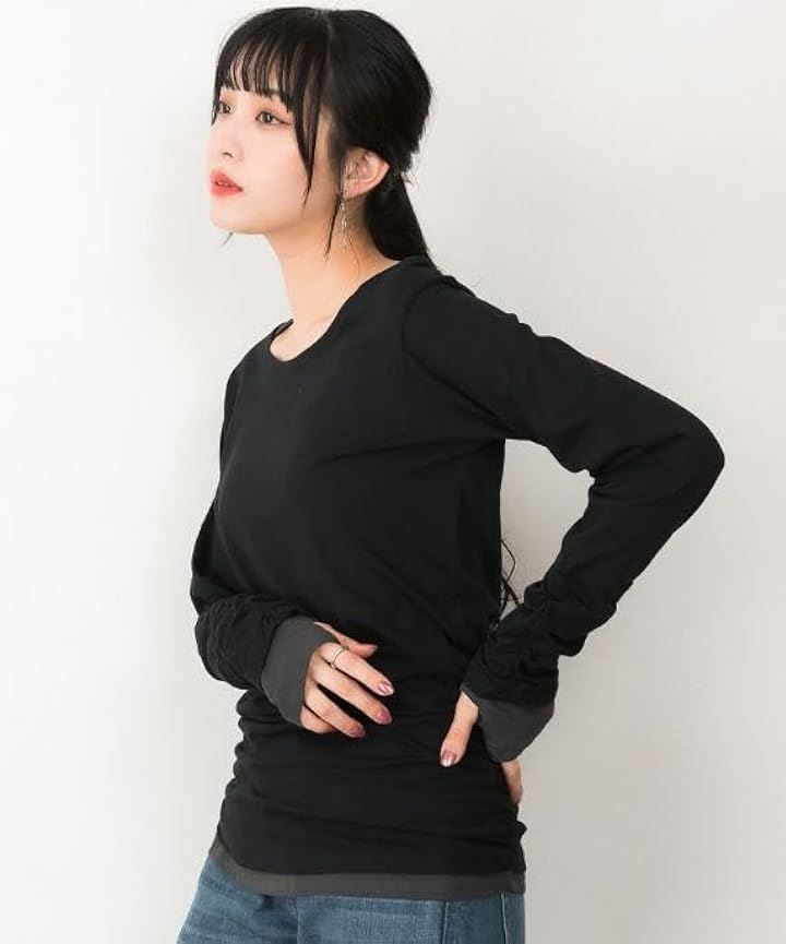・手元の指穴とくしゅくしゅを演出するシャーリングが可愛いく演出、定番ロングTシャツに。