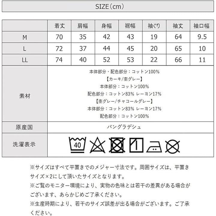 「LLサイズ着丈:74cm、肩幅:40cm、身幅:52cm、裾幅:53cm、袖ぐり:22cm、袖丈:66cm、袖口幅:11cm」