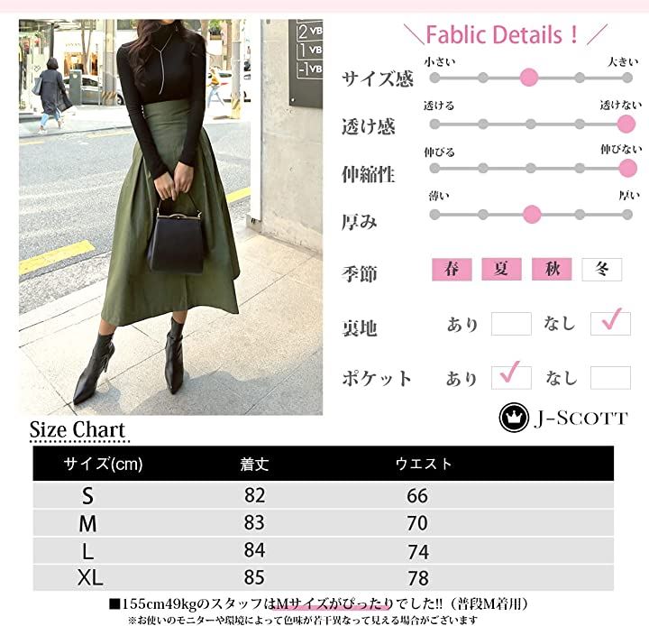 ハリのある素材感と、前後にしっかりと入ったダーツにより美しいAラインシルエットが保たれ、ハイウエストにより腰位置が高くなることで、自然と女性らしいシルエットを演出してくれます* ふくらはぎが隠れるミモレ丈で足元はスッキリ* ミニマムサイズの方でも、バランス良く着こなしていただけます。