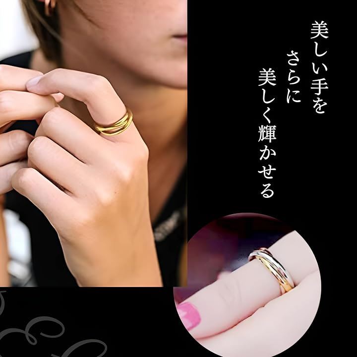 「特徴」 チタン素材で軽量かつ耐久性に優れる 3連デザインが指先を立体的に見せる ゴールド シルバー ピンクゴールド ブラックの4色展開 シンプルでどんなスタイルにも合わせやすい ユニセックス対応で男女問わず着用可能