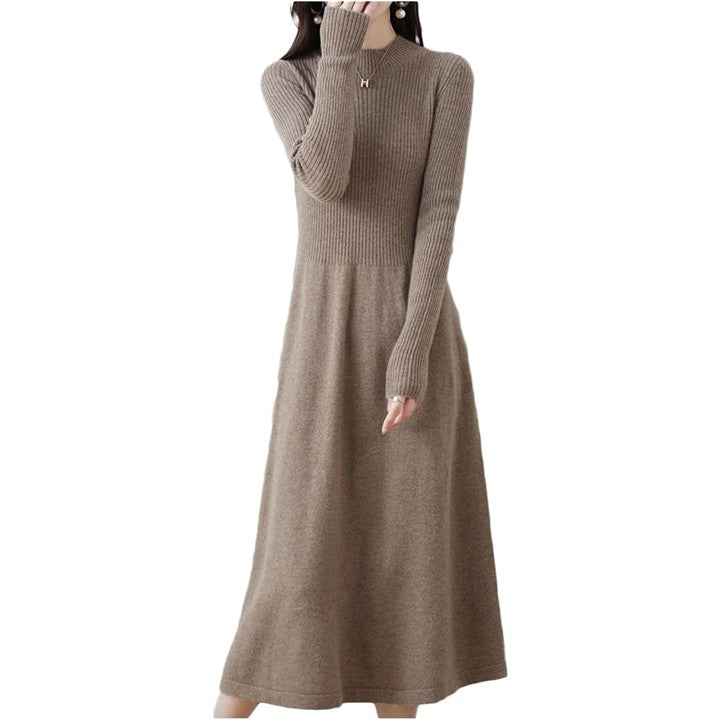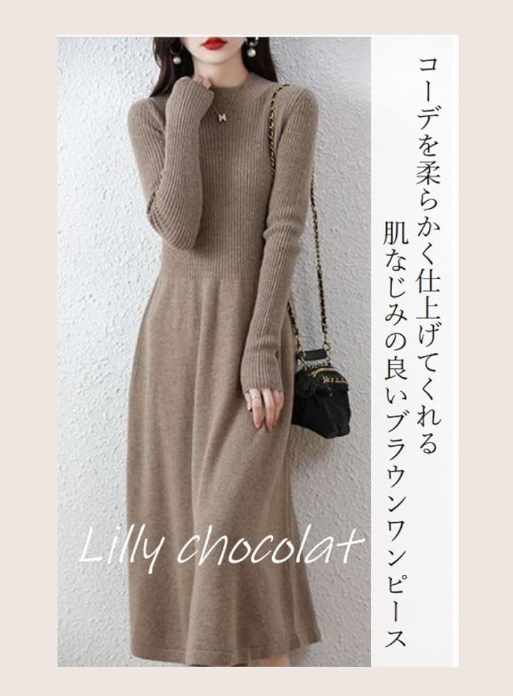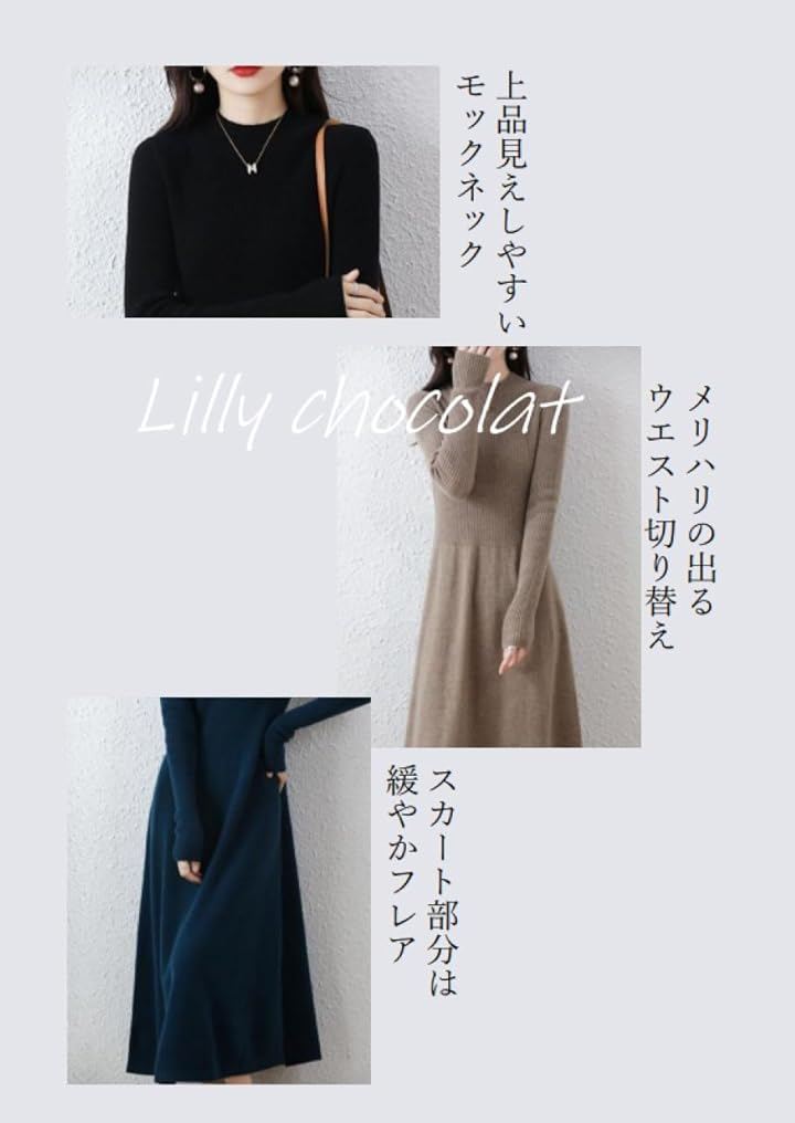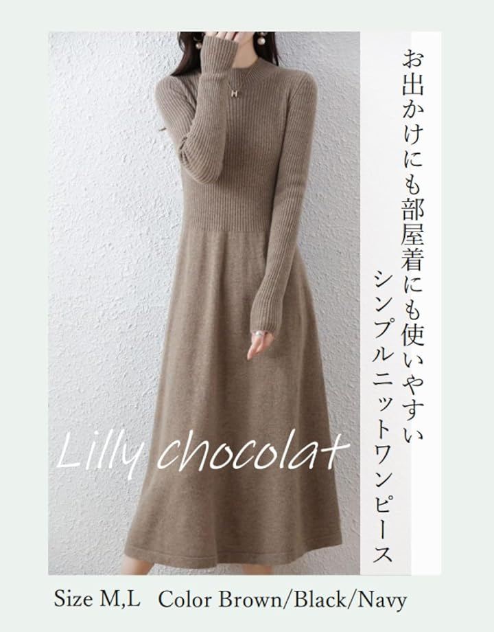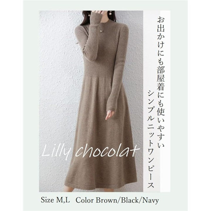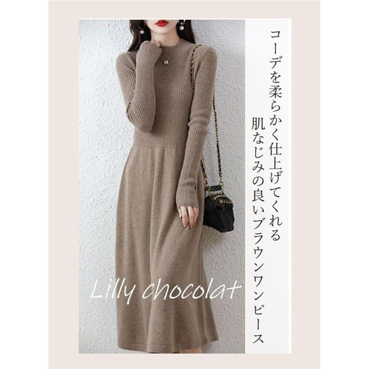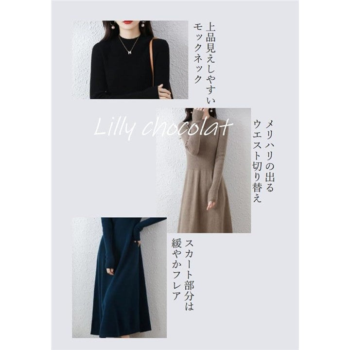 ニットワンピース レディース 冬 ミモレ丈 リブ 秋冬 aライン ハイネック 長袖 フレア 上品 通勤 切替 切り替え 切替え シンプル シンプルワンピース