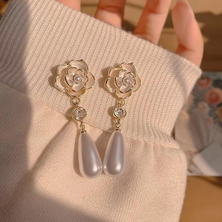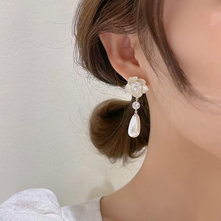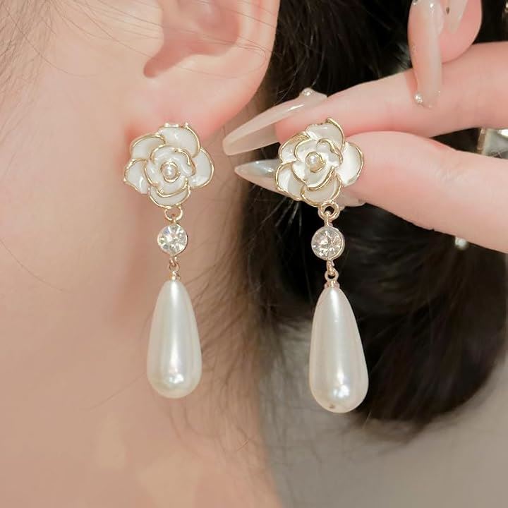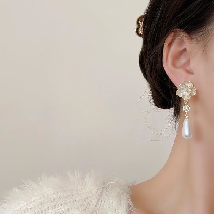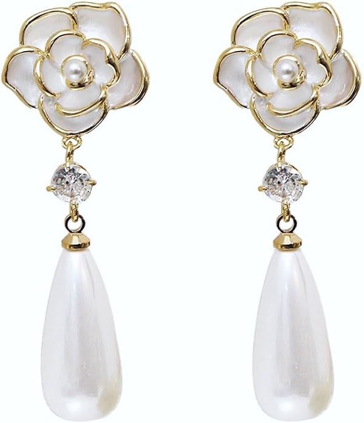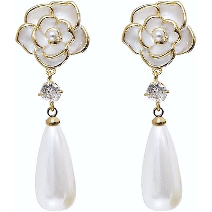 薔薇 ピアス ホワイト キュービックジルコニア 垂れ下がり パール調 両耳用2つ入り ギフト 誕生日 パーティー 結婚式 上品 人気デザイン