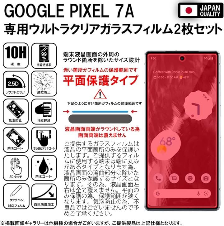 指紋認証対応版2枚セットフィルム Google Pixel 7A ガラスフィルム 保護フィルム 強化 高透過 高光沢 日本製 旭硝子 0.26mm 硬度10H