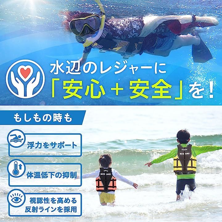 WATER GAMES ライフジャケット フローティングベスト シュノーケリングベスト 大人用 子供用 防水スマホケース 付き 日本国内メーカー 一般財団法人日本船舶品質管理協会 製品安全評価センター 浮力測定実施済 (子供用 Sサイズ(身長100~140cm)/ ライムイエロー) |