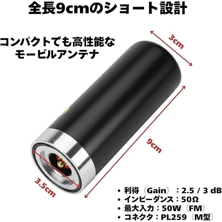 モービル 用 ショート ミニ アンテナ 9cm デュアルバンド 136-174 / 400-470MHz 最大 50W 対応 PL259 M型 コネクタ 車載 無線機 低背タイプ アマチュア
