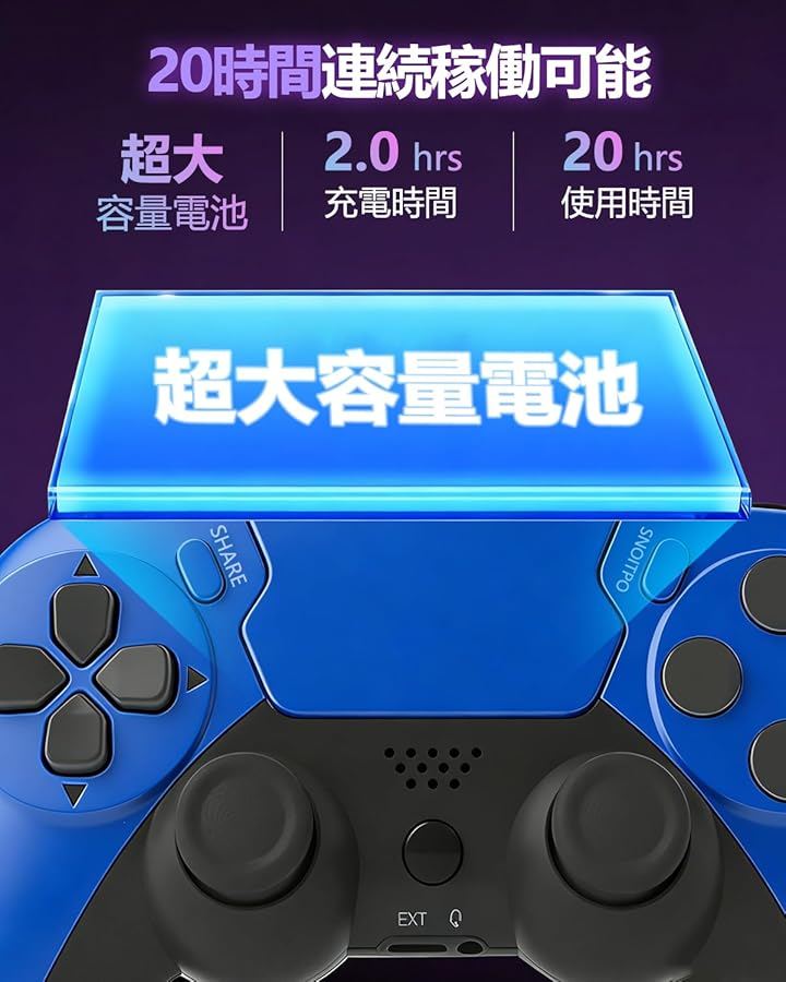 大容量バッテリーと急速充電(2 時間フル充電 / 最大 20 時間連続使用)、低電圧警報機能も搭載。ps4 コントローラーやワイヤレスコントローラーとして使用しても、機能性と握持感を両立した理想的なデザインです。