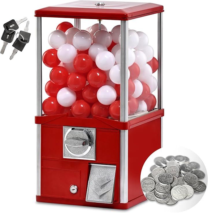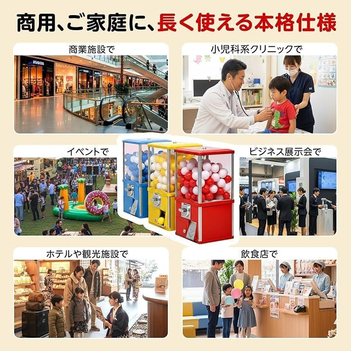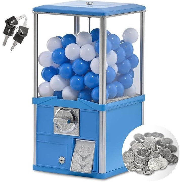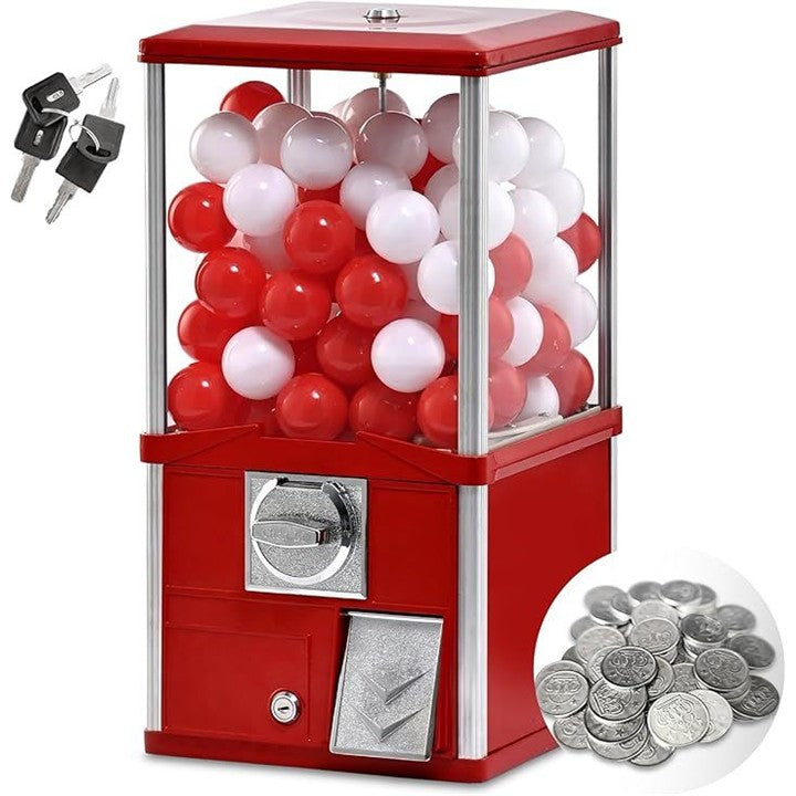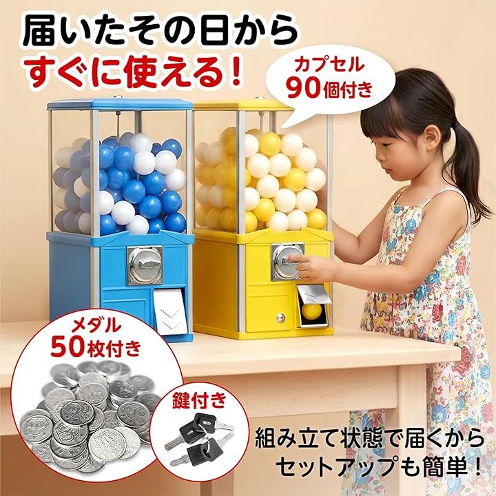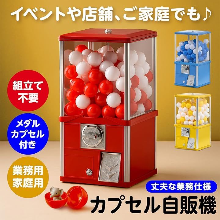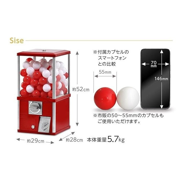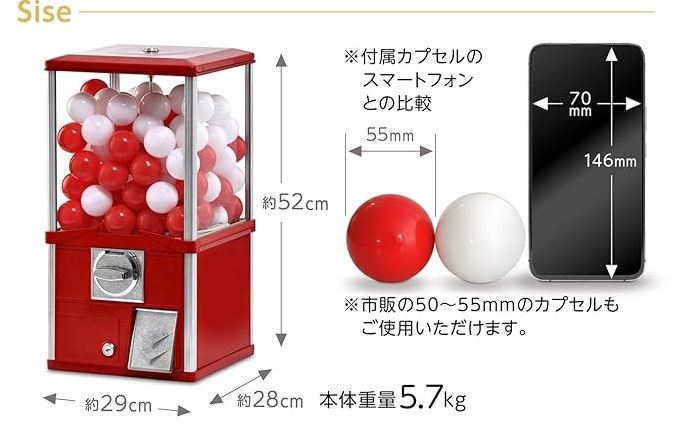 業務用 高耐久 カプセル自販機 本体 メダル式 50mm対応 アルミ+鉄+アクリル製 組立不要 家庭用 イベント用 店舗用 カプセル90個付属 中身ははいってません コイン50枚付き