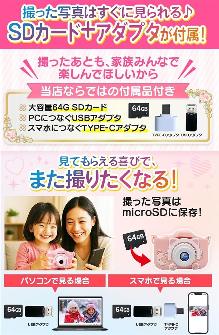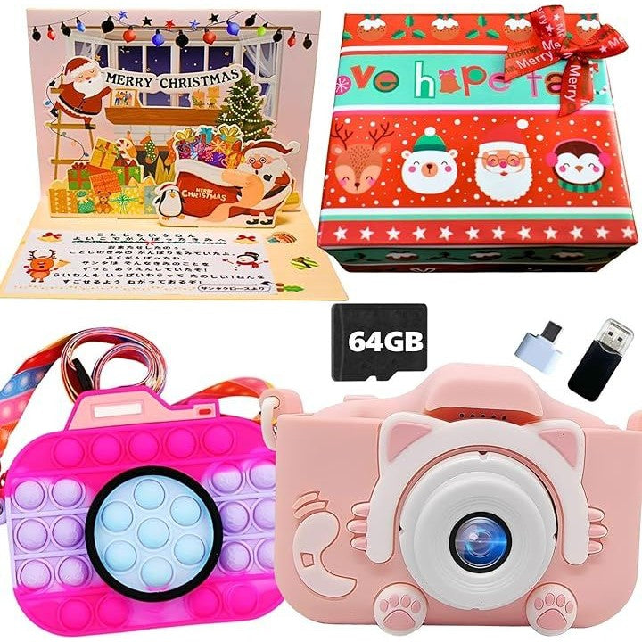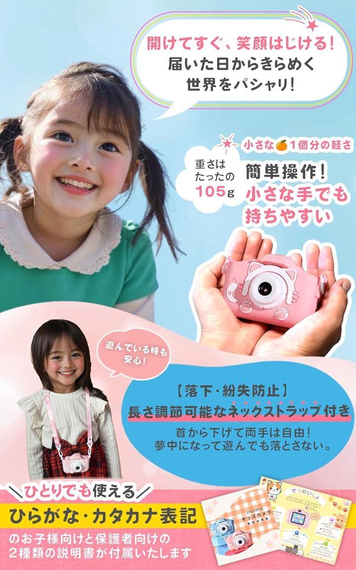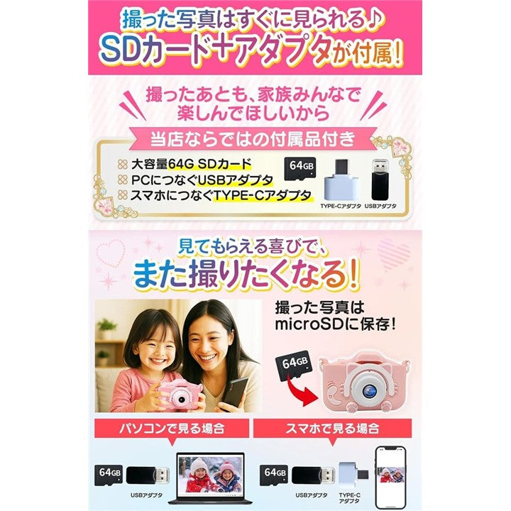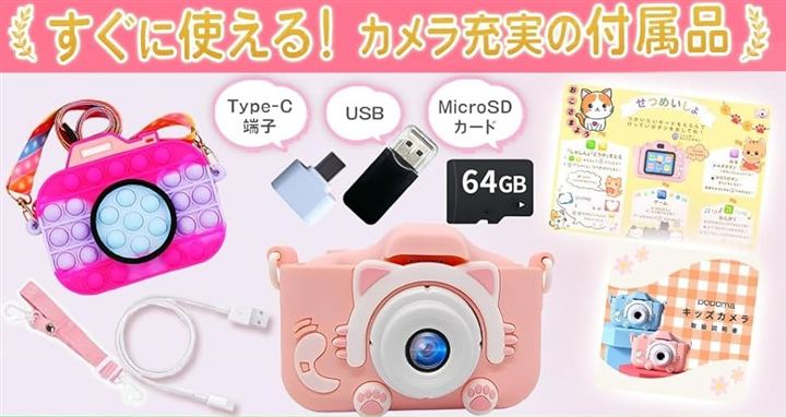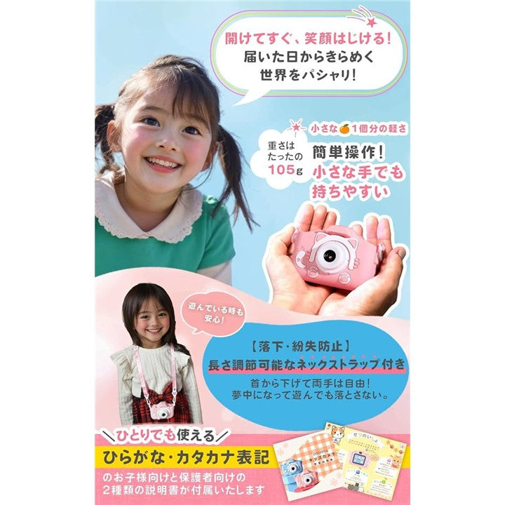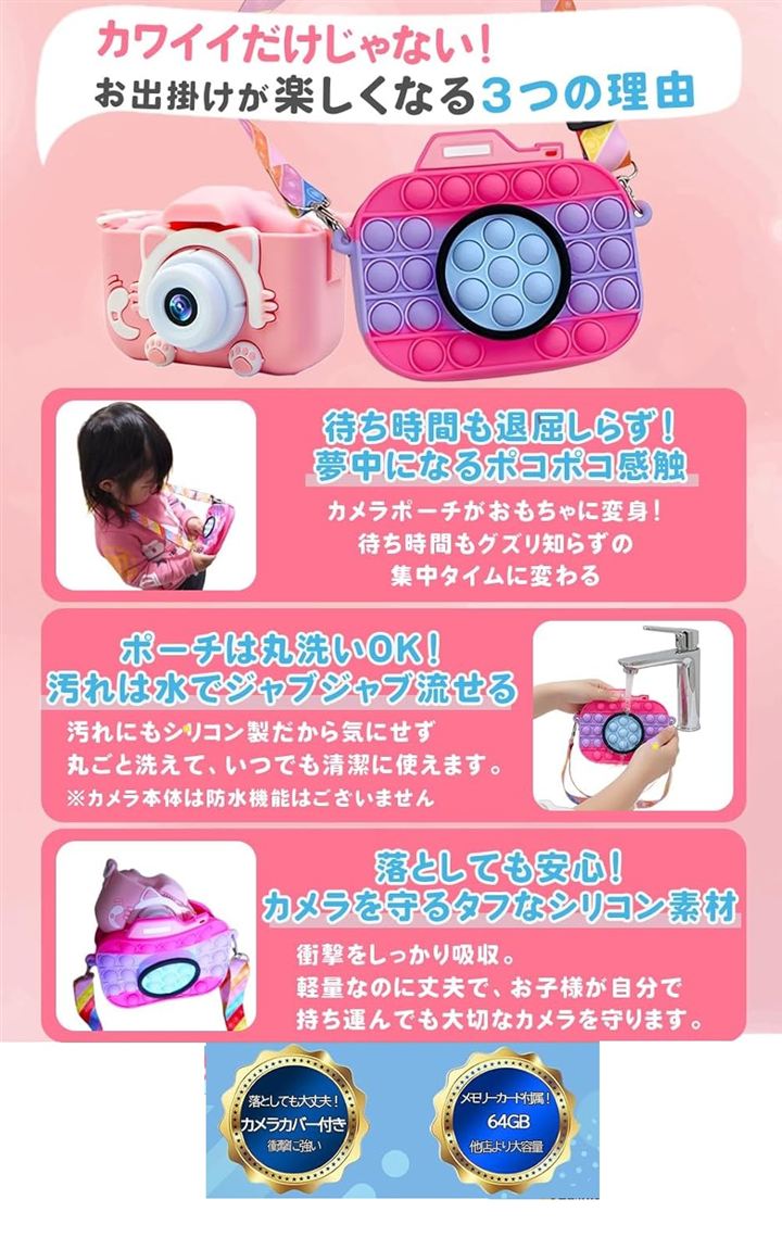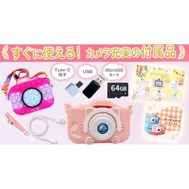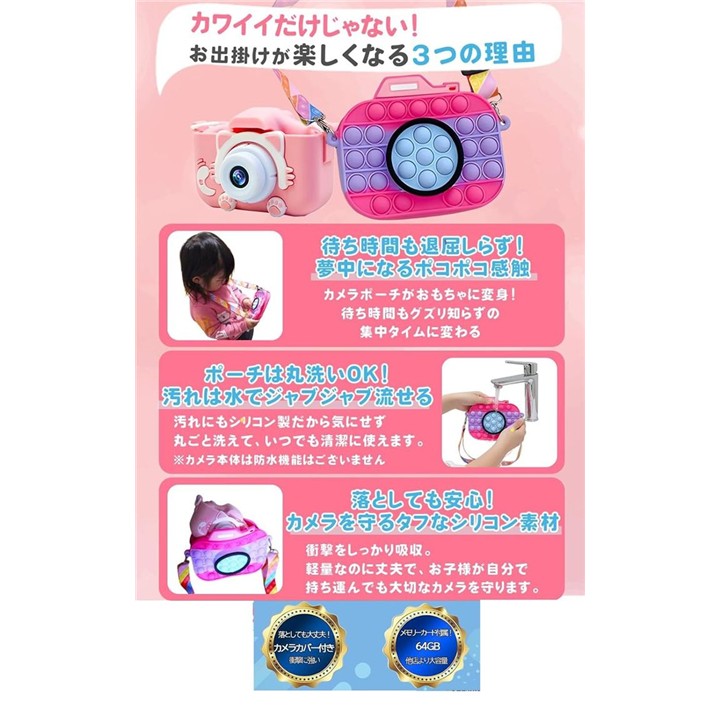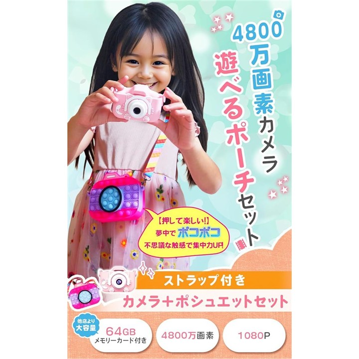 64GB ポシュエット付きキッズカメラ トイ 子供用 ゲーム機能 音楽プレーヤー 8倍ズーム プレゼント 女の子 男の子