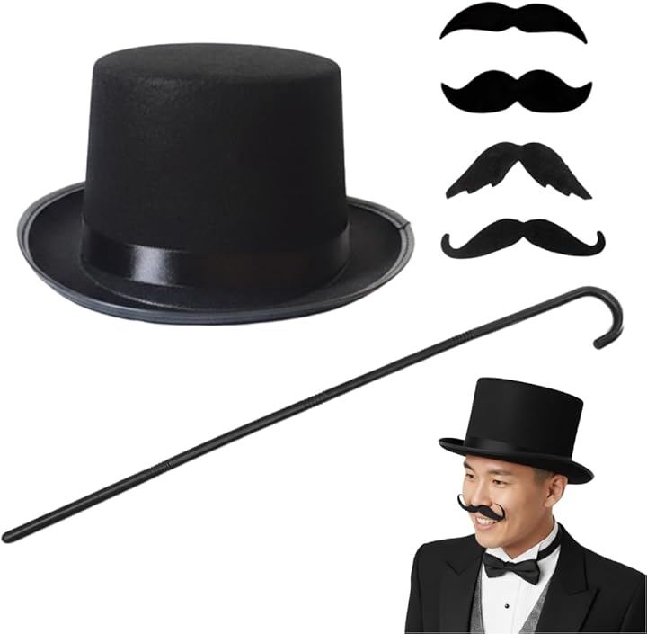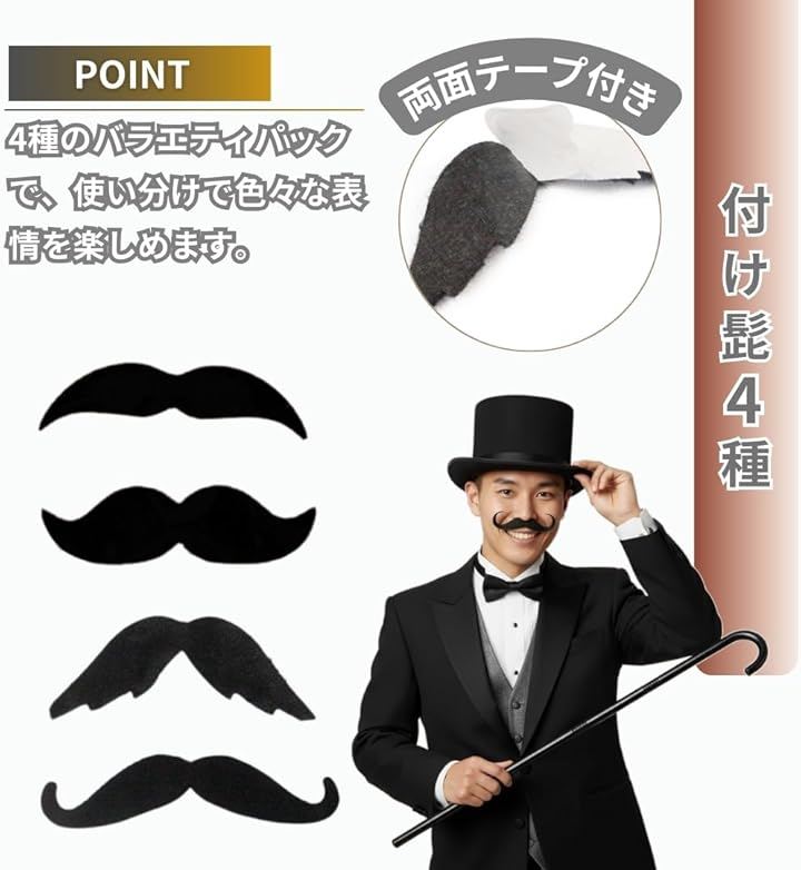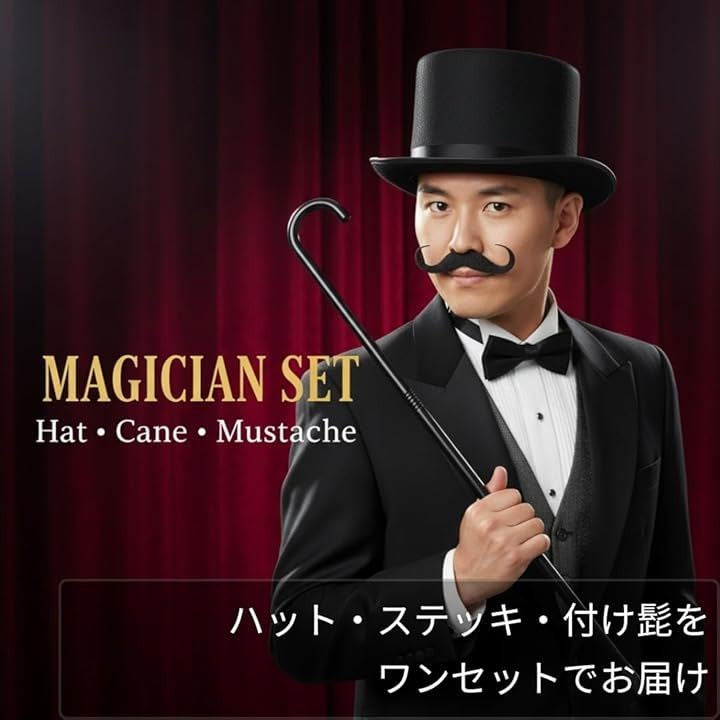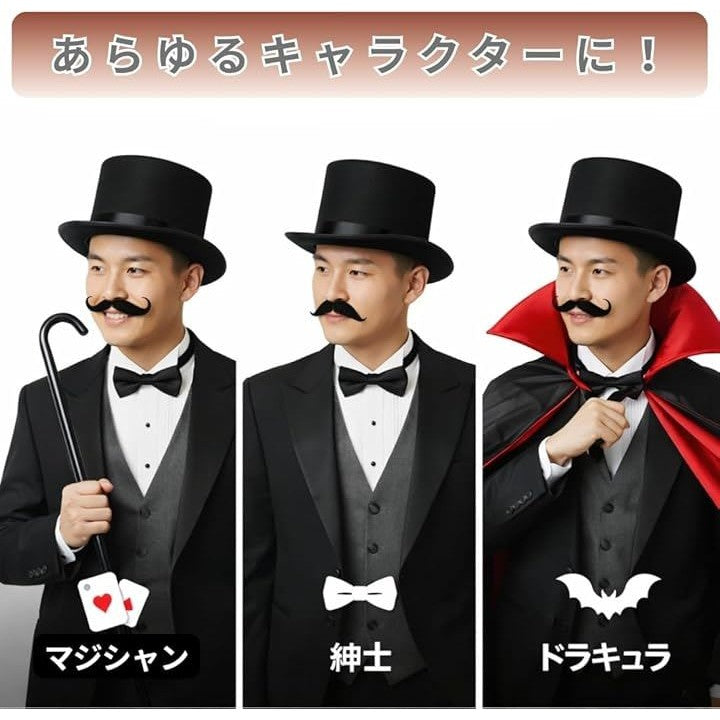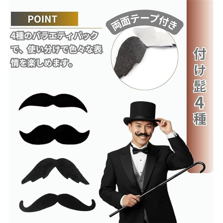シルクハット つけ髭 ステッキ 3点セット マジシャン コスプレ 衣装 付け髭 4種付属