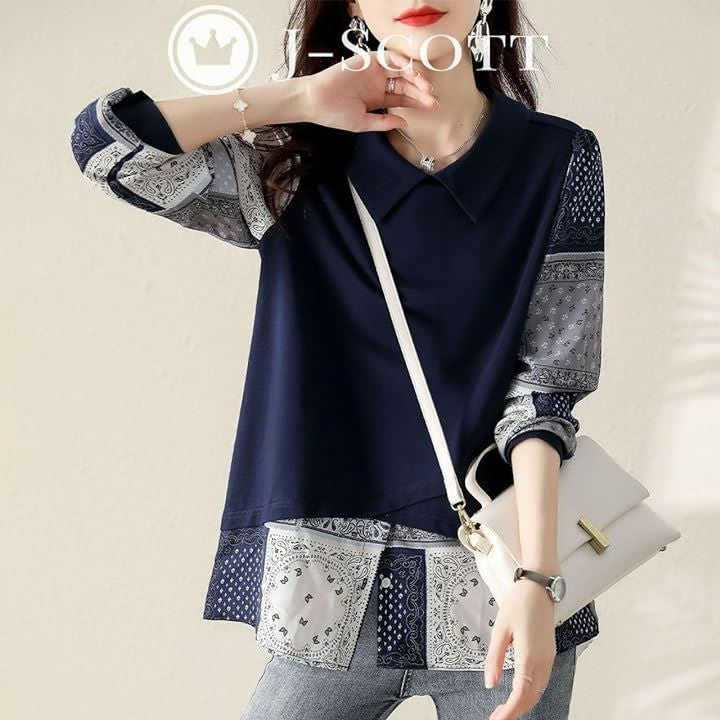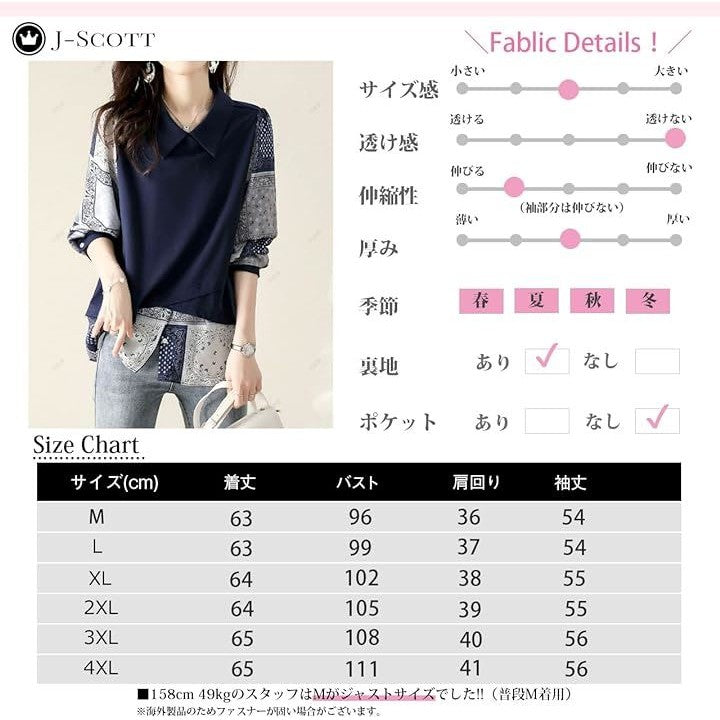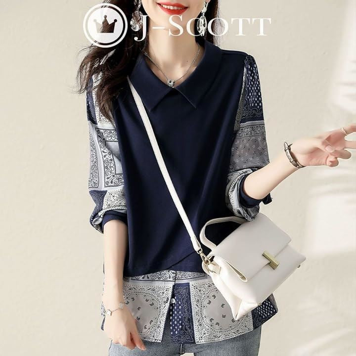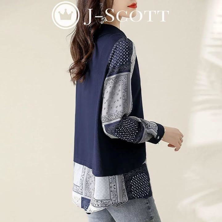 ジェイスコット レイヤード風ブラウス レディース シフォンシャツ ペイズリープリント パフスリーブ 長袖 異素材切替