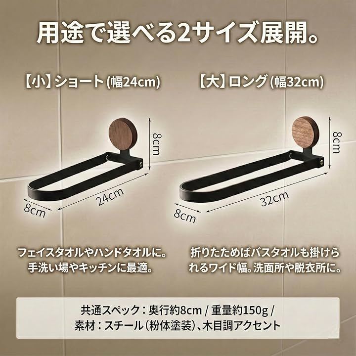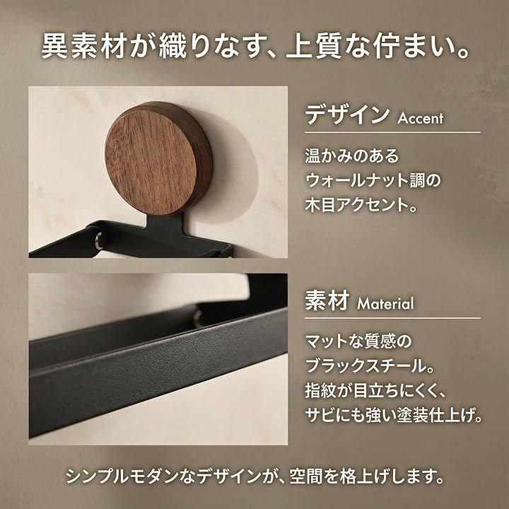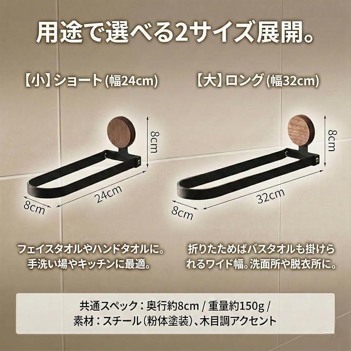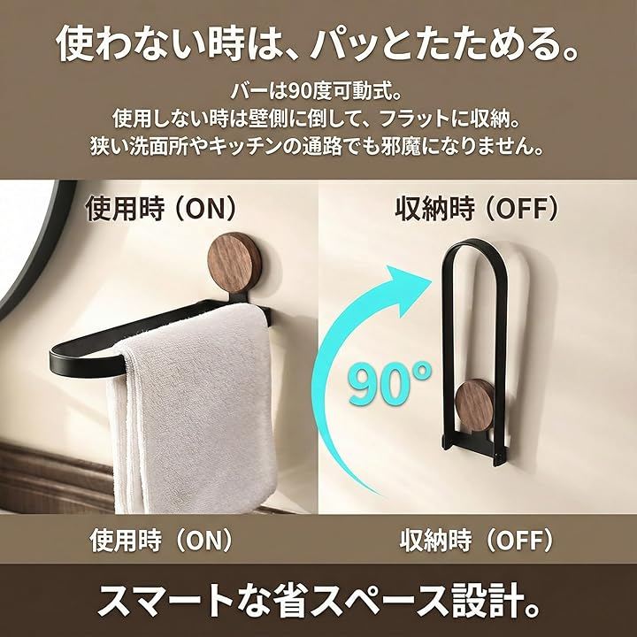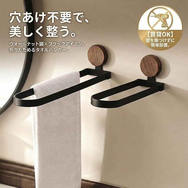 タオルハンガー タオル掛け 折りたたみ 穴あけ不要 アイアン 木目 おしゃれ 壁掛け 洗面所 キッチン タオルバー 省スペース 軽量 賃貸 DIY
