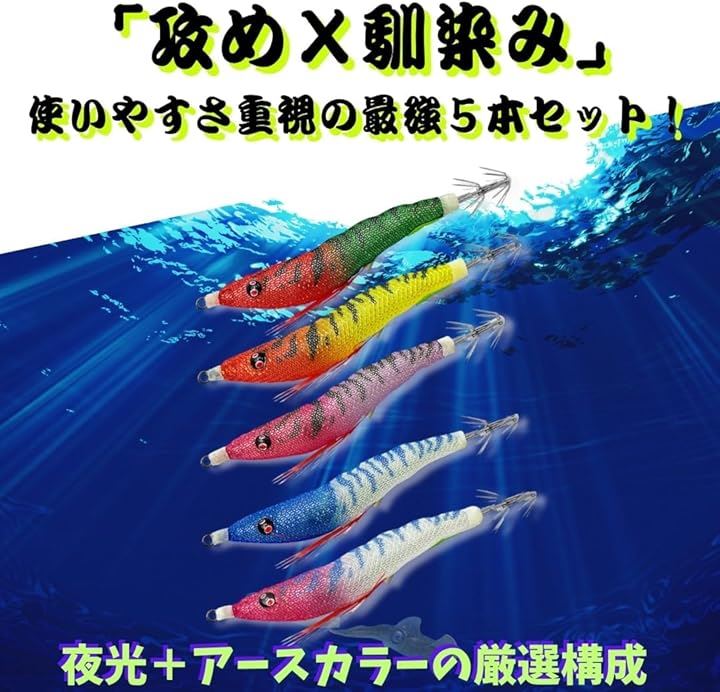 夜釣りやディープレンジでは、蓄光素材の夜光スッテやUVカラーが発光し、低活性のイカに強烈なアピールを与える。