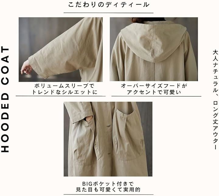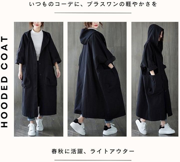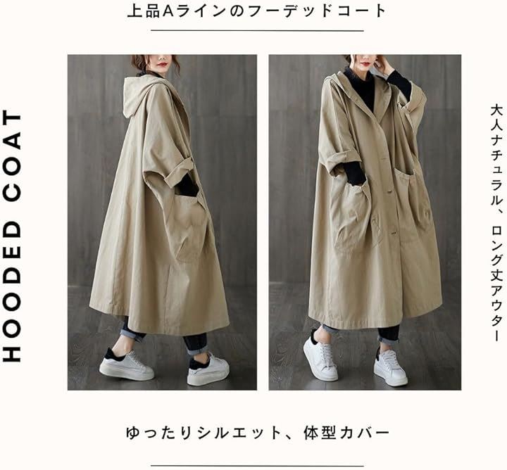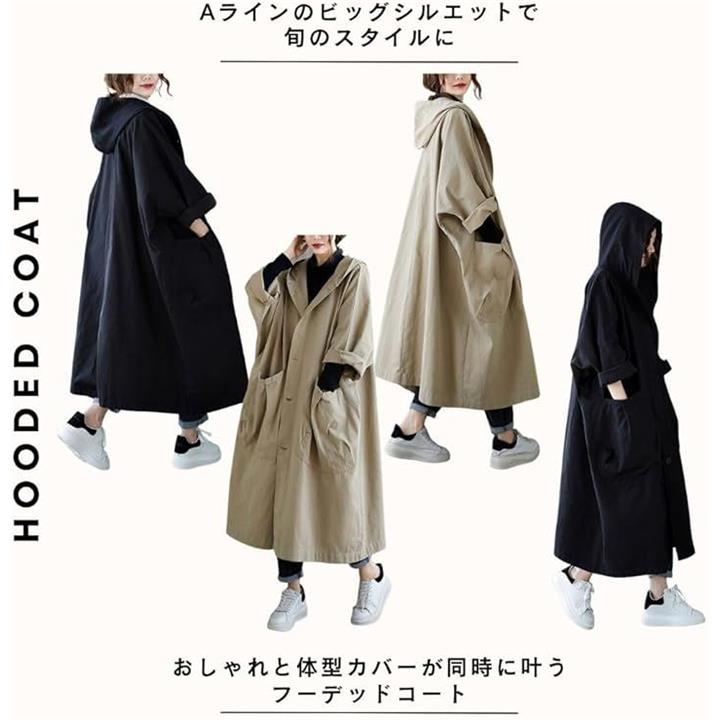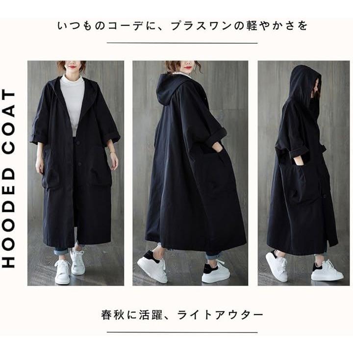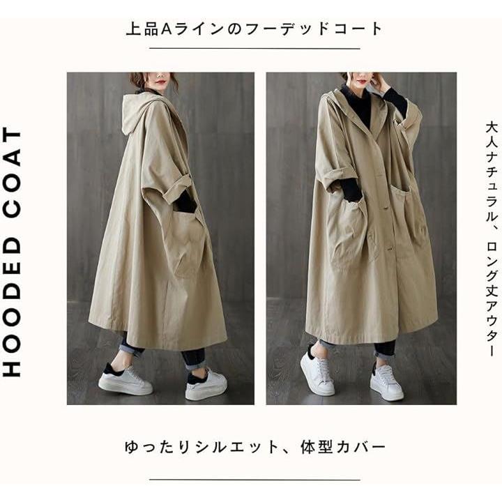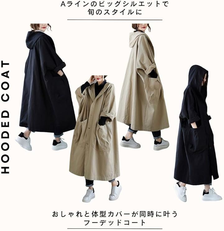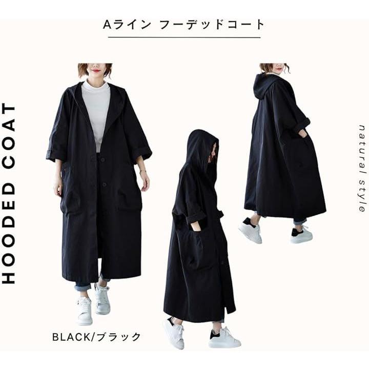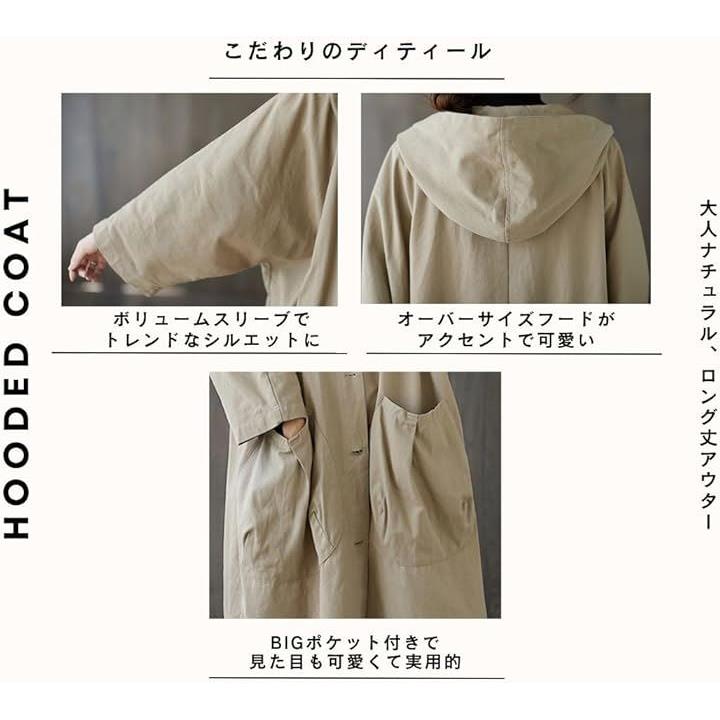 Aライン フーデッドコート レディース 軽アウター ロング丈 綿混・5色展開 ゆったりビッグシルエット