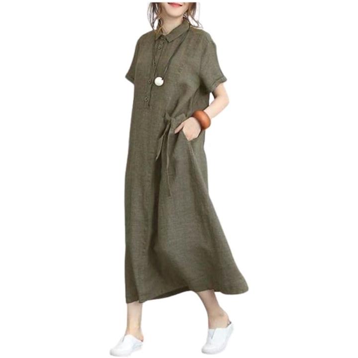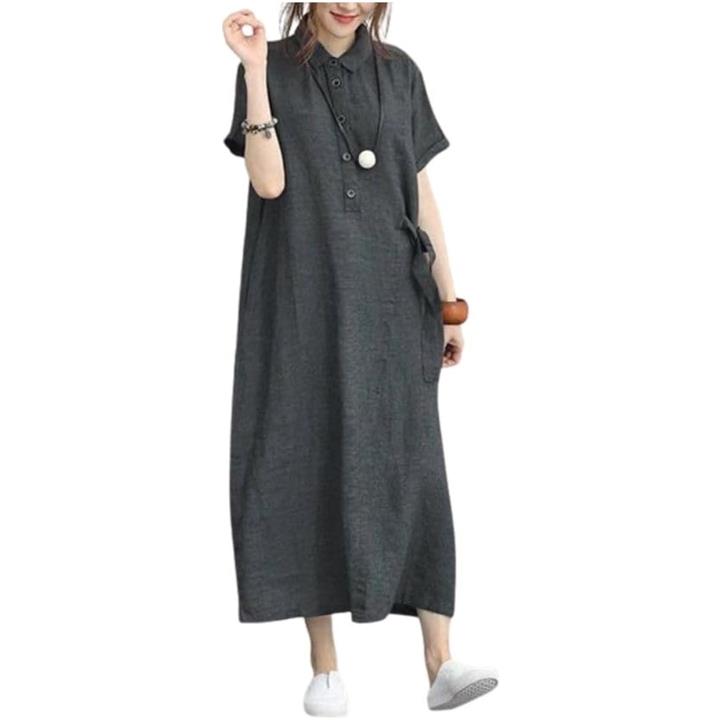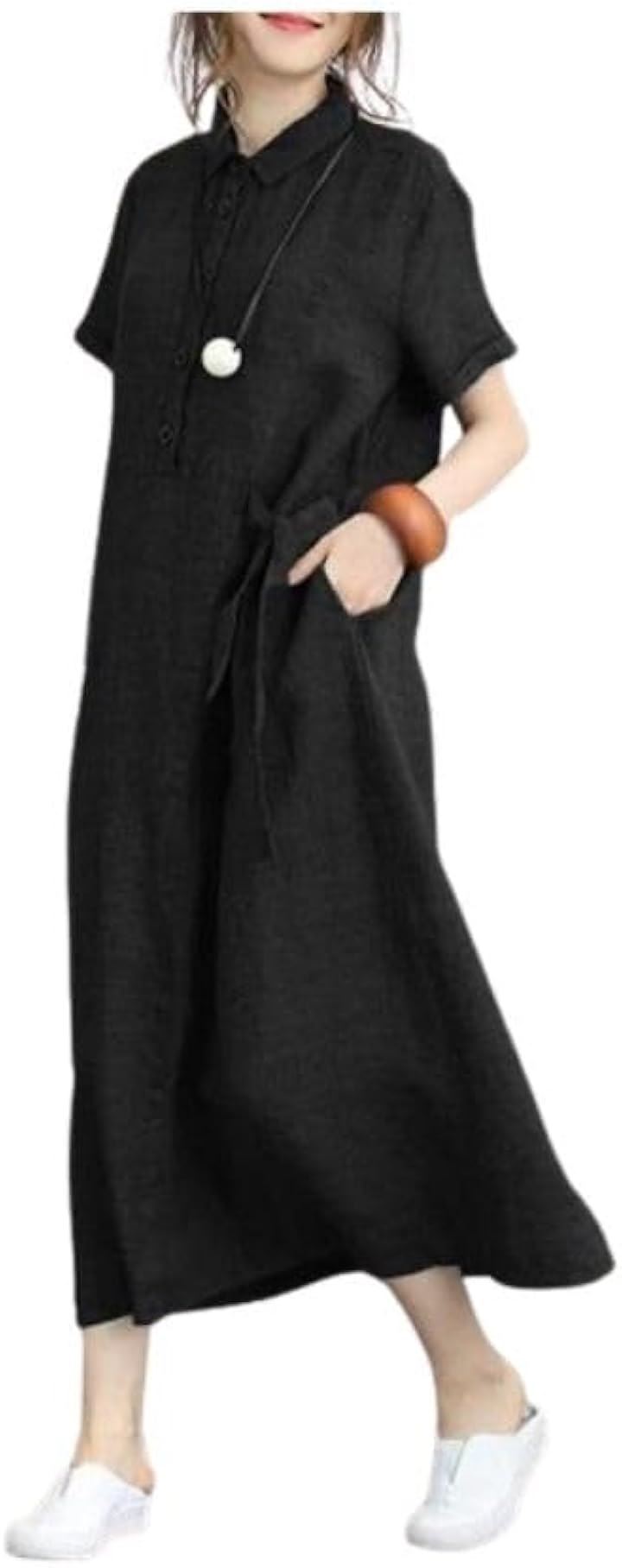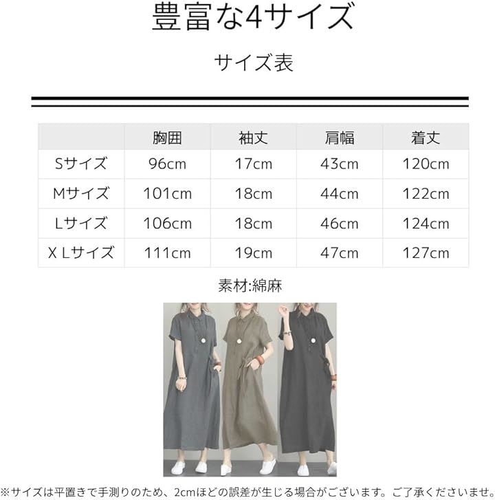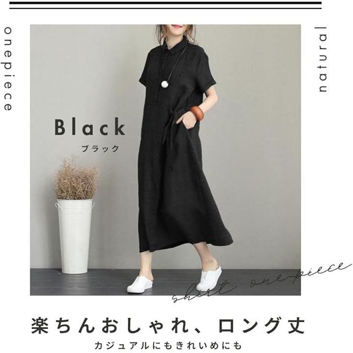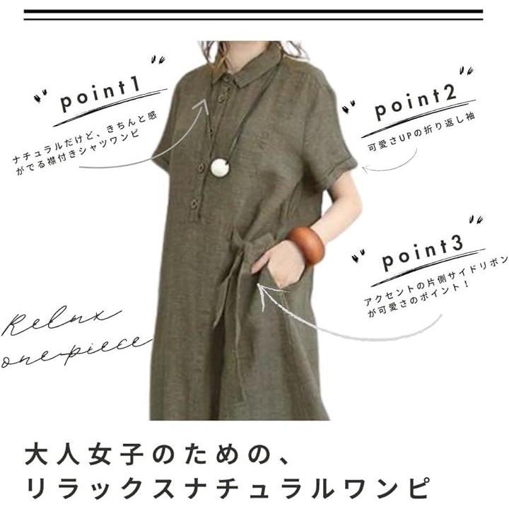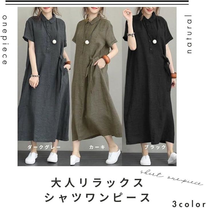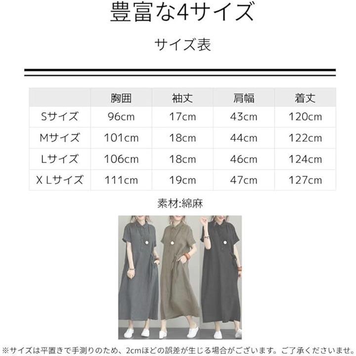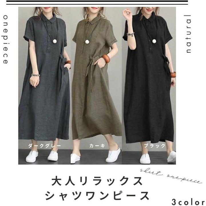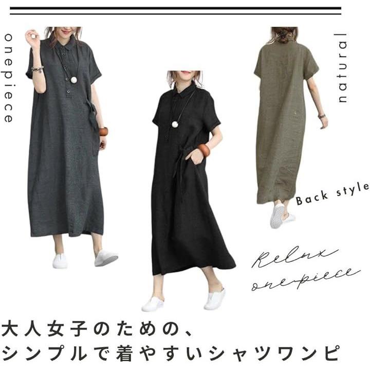 [ROOOOM] 大人のためのリラックスワンピース ナチュラルシャツワンピ 綿麻素材 体型カバー 半袖 ロング丈 3色展開・4サイズ |