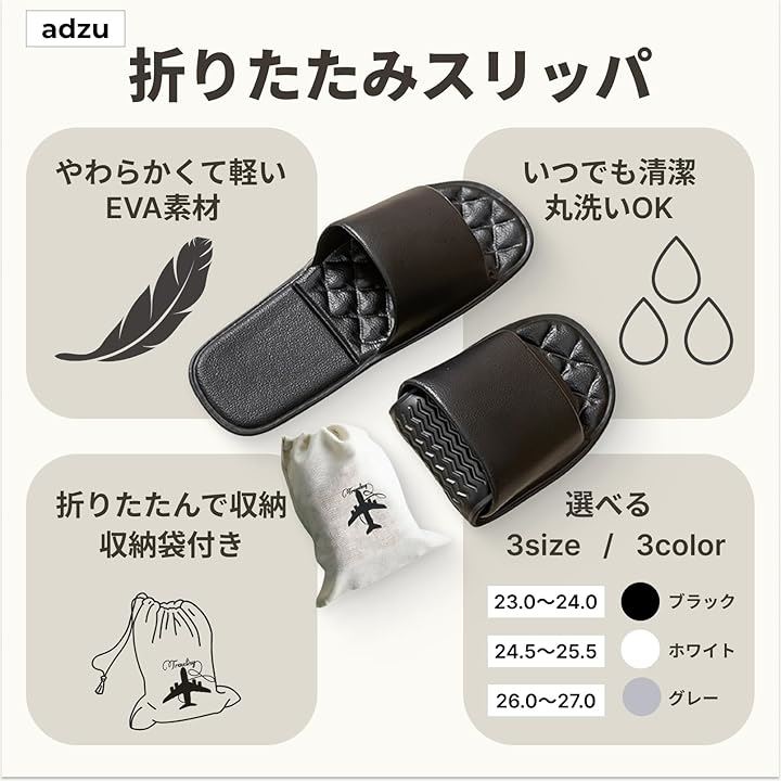 [adzu] 折りたたみスリッパ 携帯スリッパ 機内用 室内 折りたたみ 旅行 飛行機 トラベル 収納袋付き 軽量 持ち運び 学校 海外旅行 新幹線 |