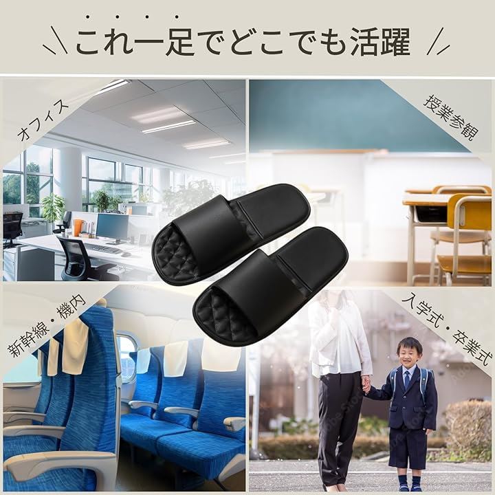 「様々なシーンで活躍する携帯スリッパ」 旅行、飛行機や新幹線での移動、トラベル中のホテル滞在、オフィスの室内履き、参観日や入学式など学校行事まで、幅広いシーンで活躍する折りたたみスリッパです。