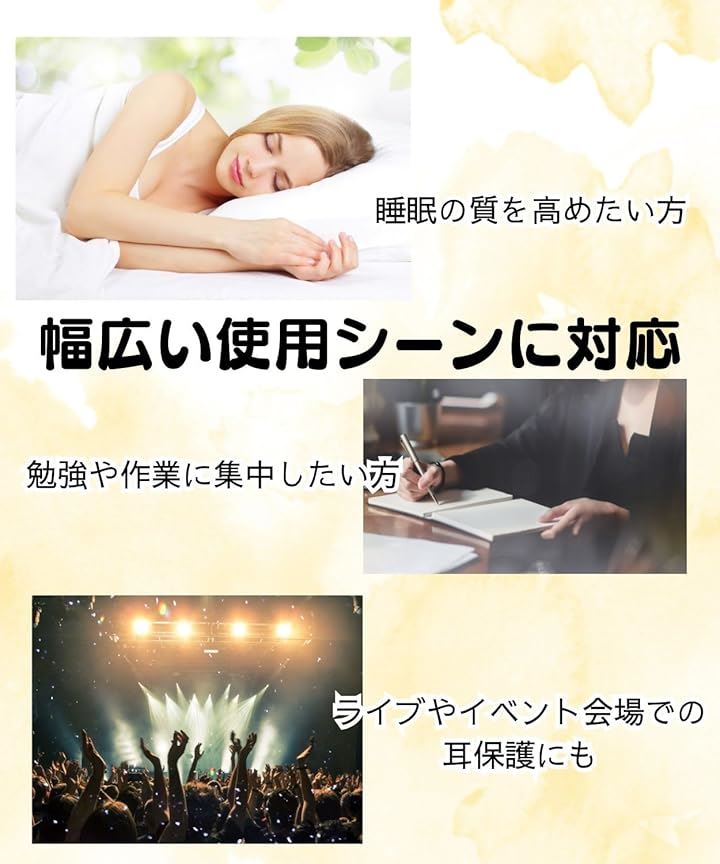 本製品は、睡眠、工事現場、勉強、ライブ、飛行機、旅行など多様な場面で使用可能です。