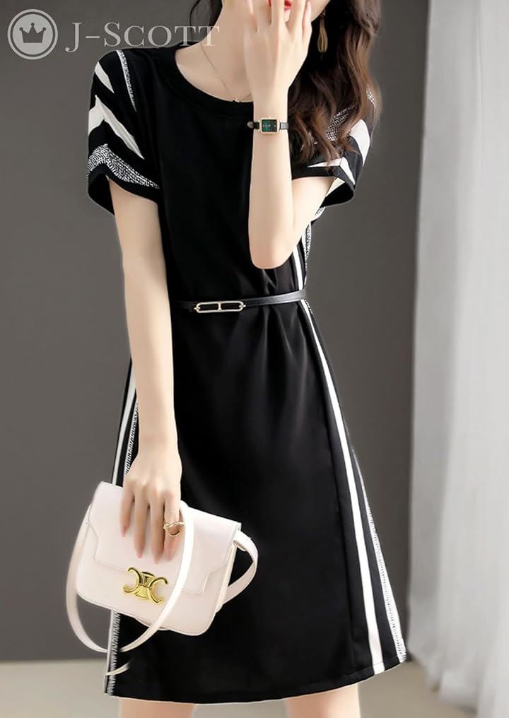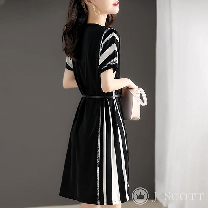 [J-Scott] ベルト付きストライプ柄ワンピース 膝上丈 フレア 半袖 ドルマンスリーブ ラグジュアリー ワンピ 休日デート 春夏 おしゃれ着 春物 カップルフォト 映え 敏感肌 キレカジ ドレス 春ワンピース Tシャツワンピ シルエット モダン JSJS53-BK-S |