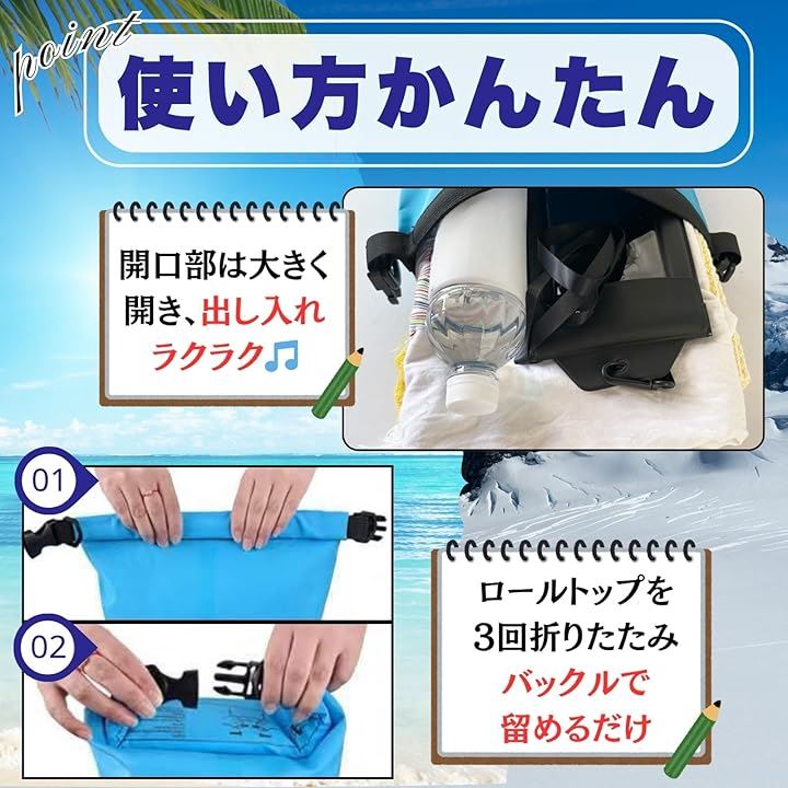 ドラム型のデザインは、荷物の出し入れがスムーズで、海水浴、釣り、キャンプ、登山、プールなど、様々なアウトドアシーンで活躍します。