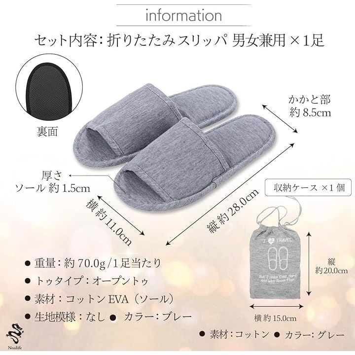 「商品仕様」セット内容:折りたたみ 携帯スリッパx2足 男女兼用 サイズ(スリッパ本体): 縦 約28.0cm 横 約11.0cm (かかと部 約8.5cm) 厚さ ソール 約1.5cm 甲バンド 約4.0mm 重量:約70.0g/1足当たり トゥタイプ:オープントゥ 素材:コットン EVA(ソール) 生地模様:なし カラー:ブラック、グレー 収納ケースx2個 サイズ:縦 約20.0cm 横 約15.0cm 素材:コットン カラー:ブラック、グレー *モニターの環境等により、色の見え方に若干差が生じる場合がございます。