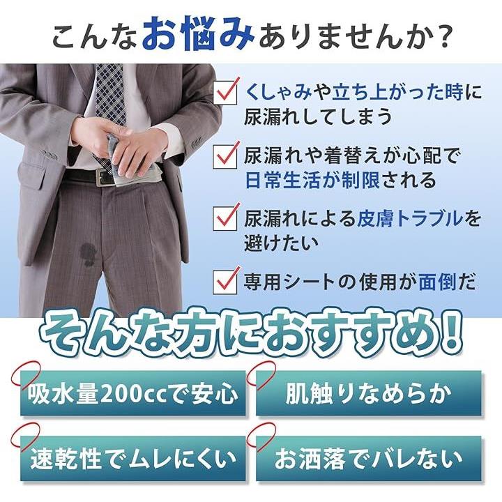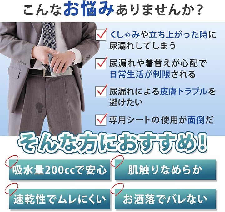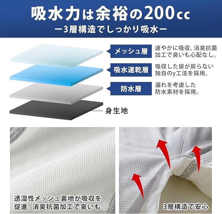 xx一度にどれくらいの量を吸収できますか?xx この尿漏れパンツは、中程度尿漏れから大量の尿漏れまで対応可能で、最大吸収量200ccの尿をしっかり吸収します。