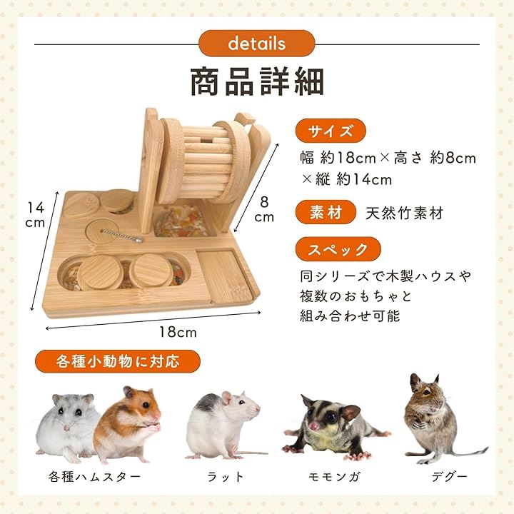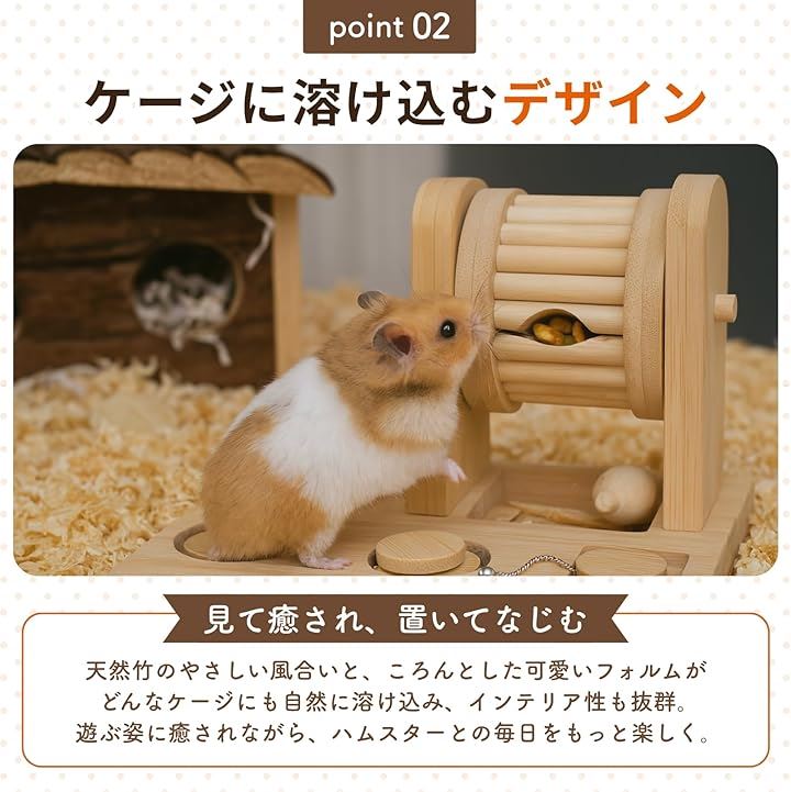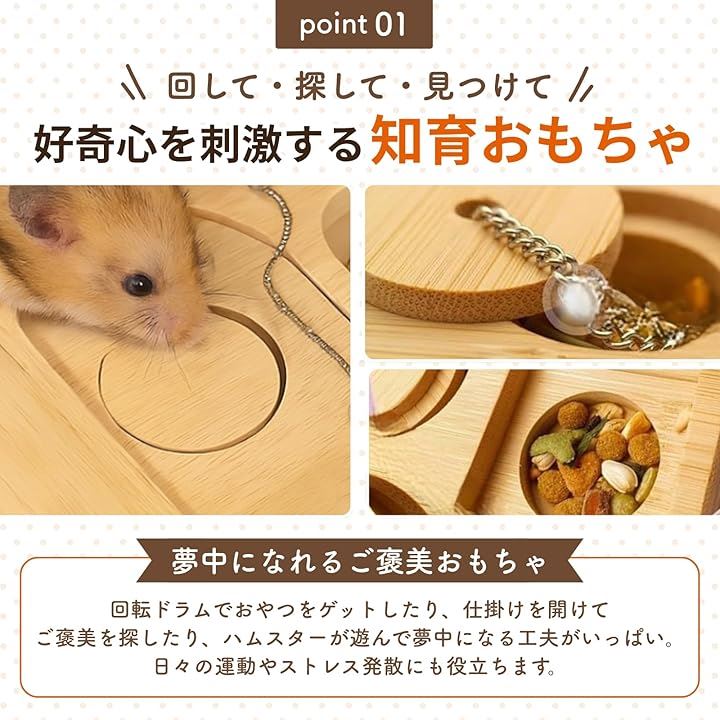 視覚的にも工夫された作りで、小動物が自ら仕掛けを発見しながら長く遊べる内容となっています。
