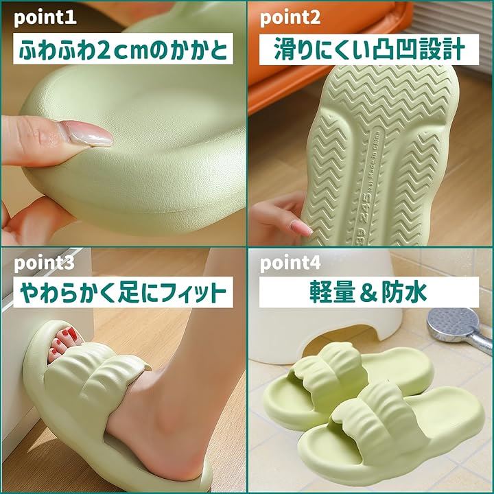 「すべりにくく安全なEVAソール」 軽量で耐久性のあるEVA素材は、水濡れにも強く、汚れてもさっと拭くだけでOK。