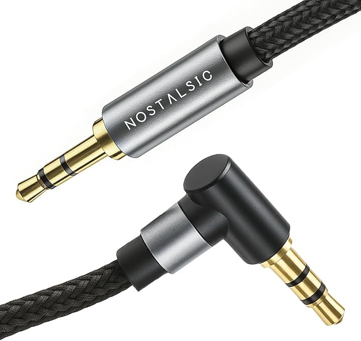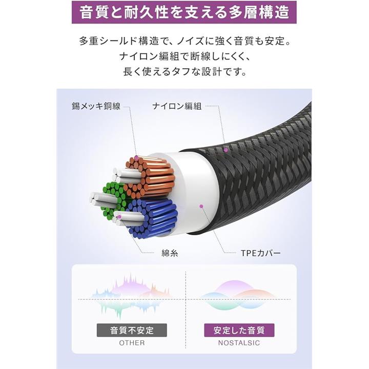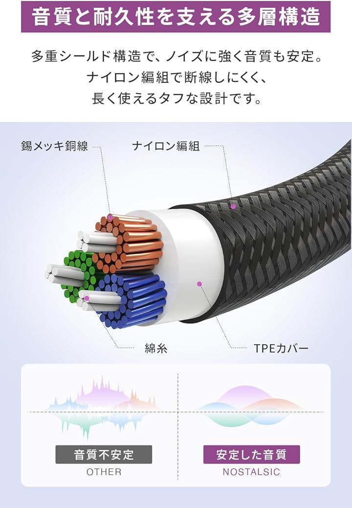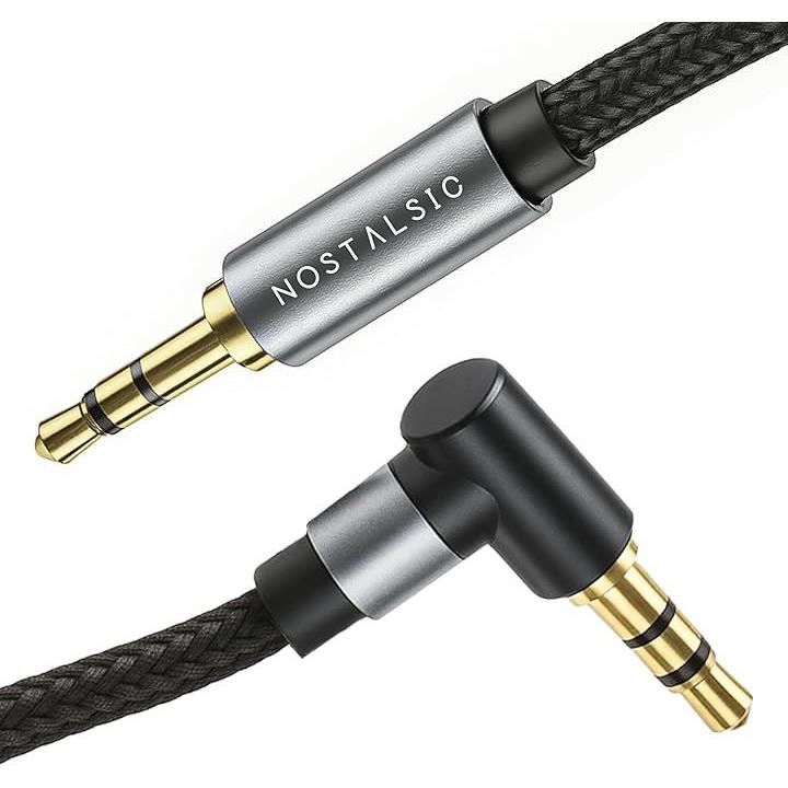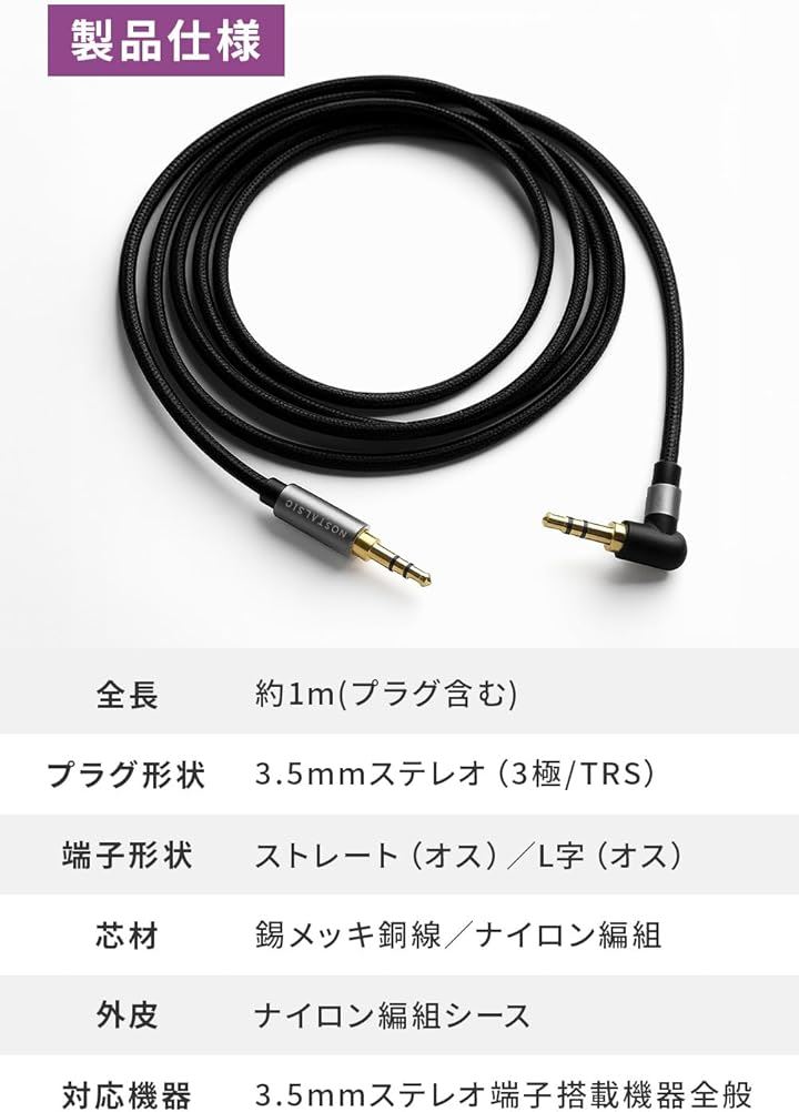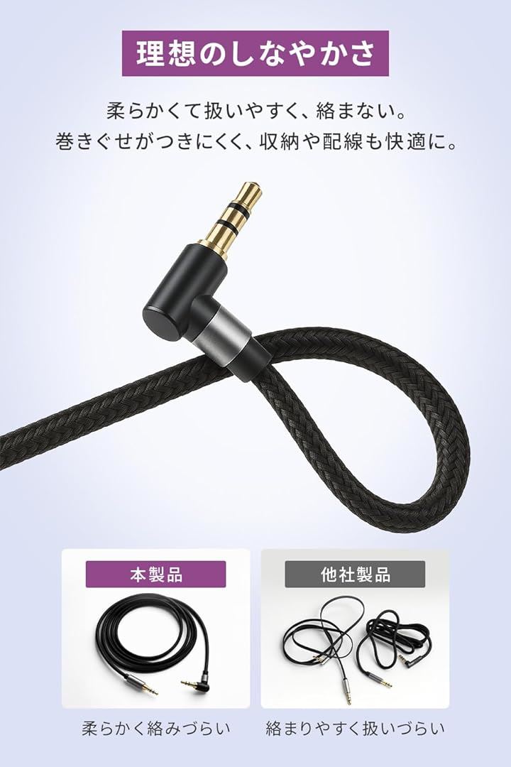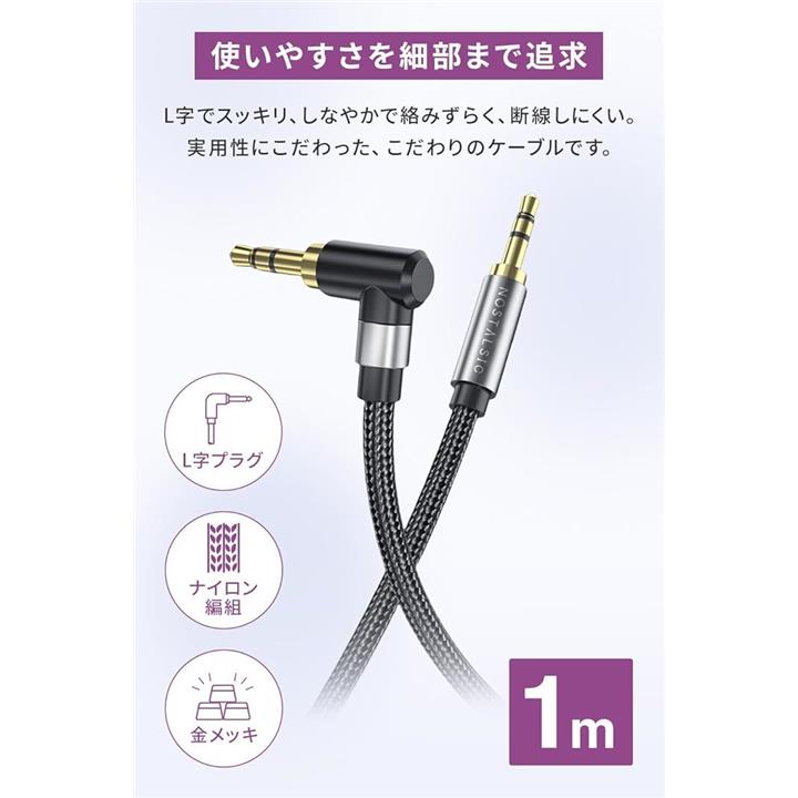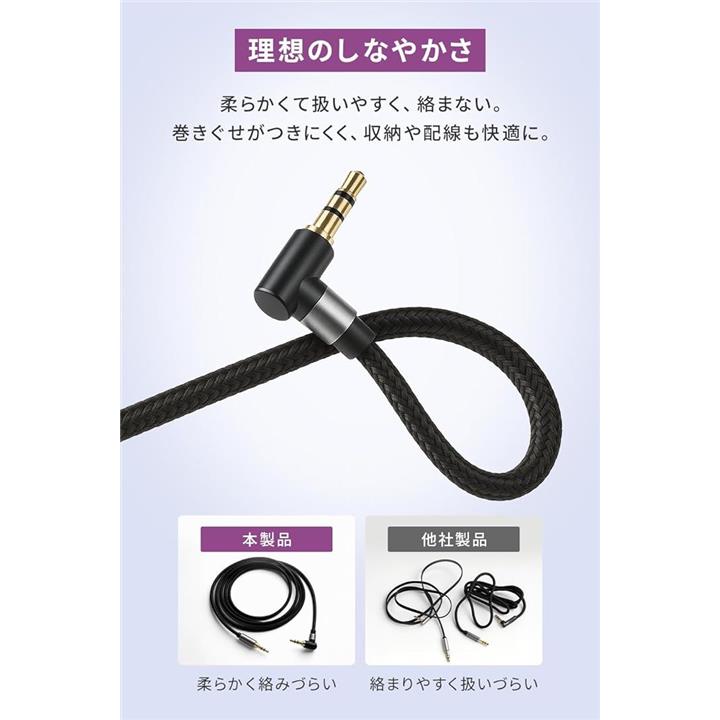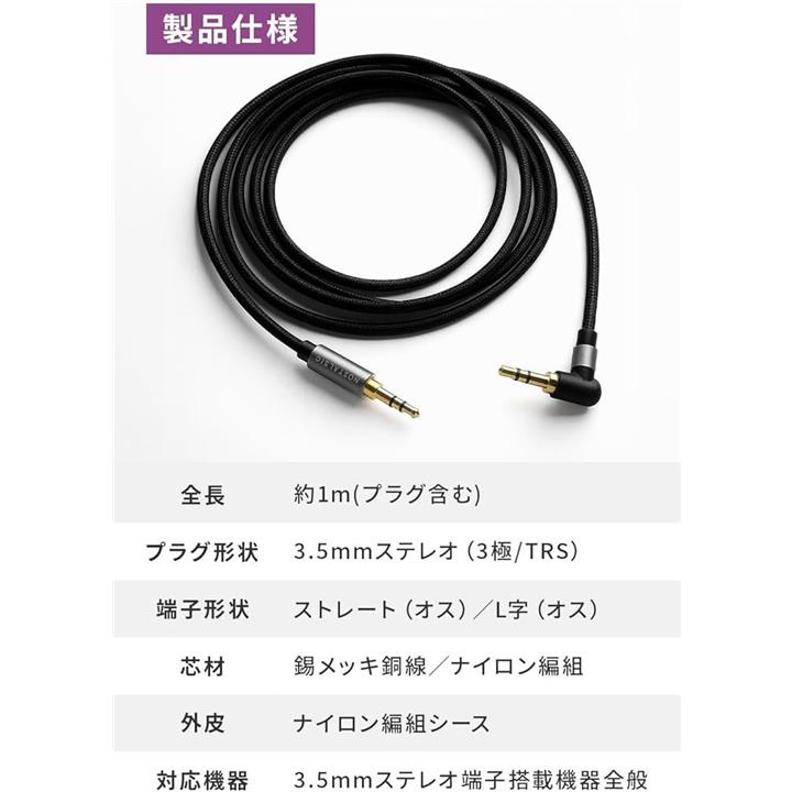 3.5mm オーディオケーブル 片側L型 1m AUX ステレオミニプラグ 高耐久 ナイロン編組 しなやかで絡まりにくい 金メッキ ヘッドホン/スピーカー