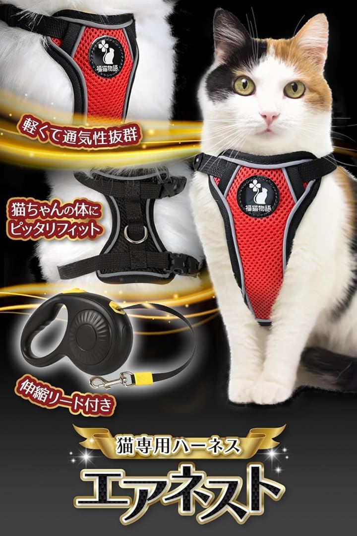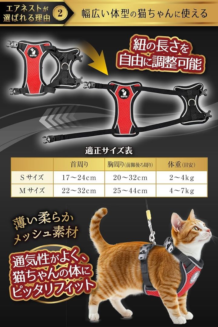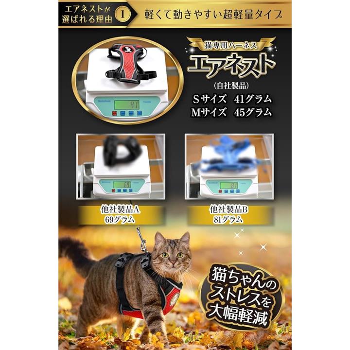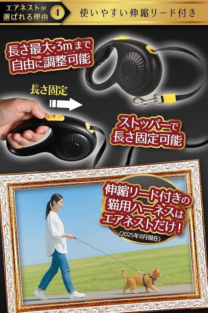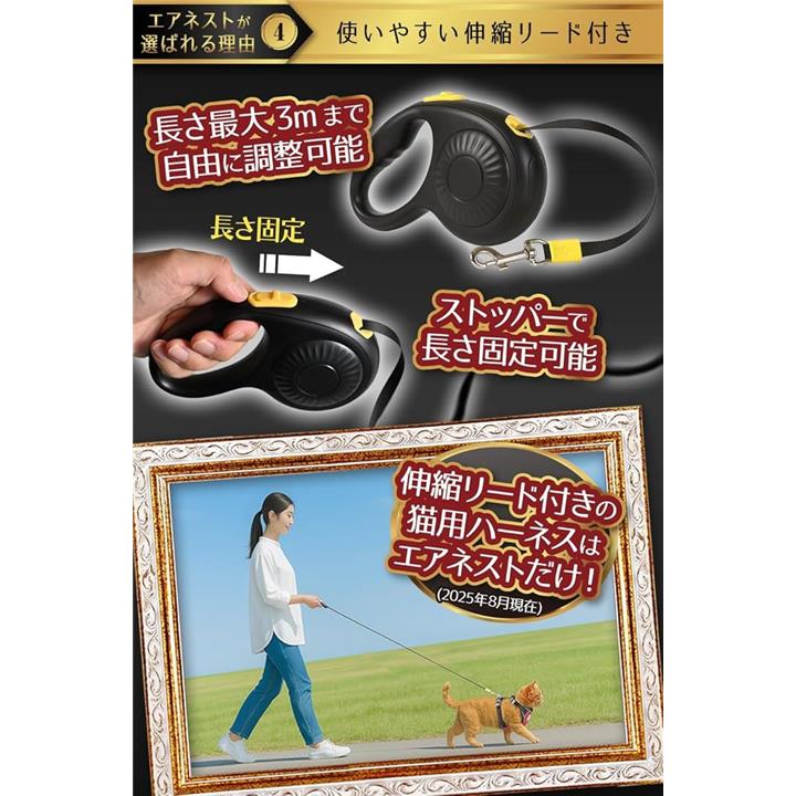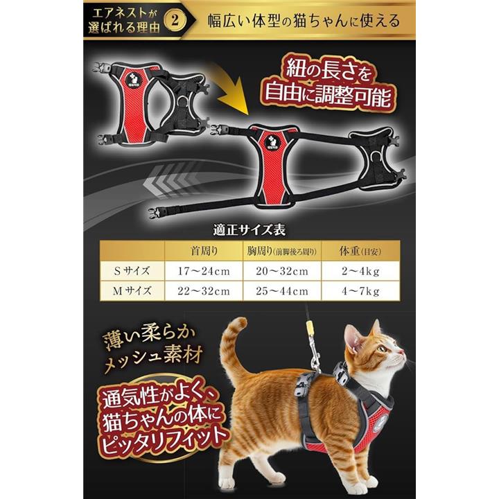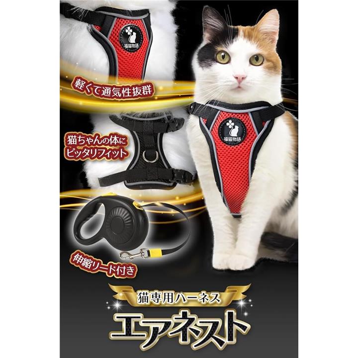 猫 ハーネス エアネスト 伸縮リード付き ベストタイプ 軽量 反射材 毛が絡まらないバックルタイプ