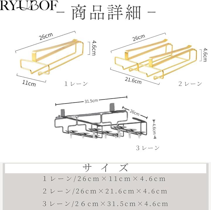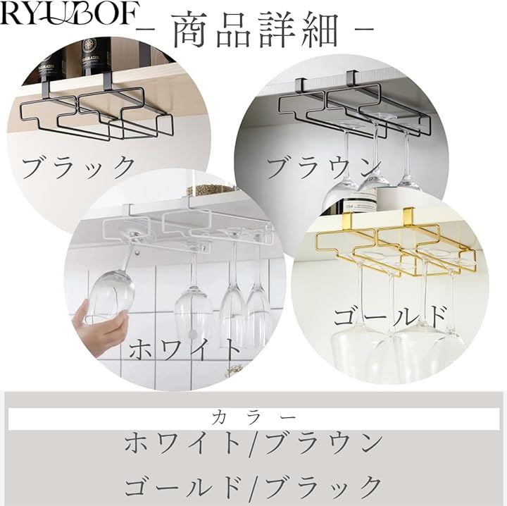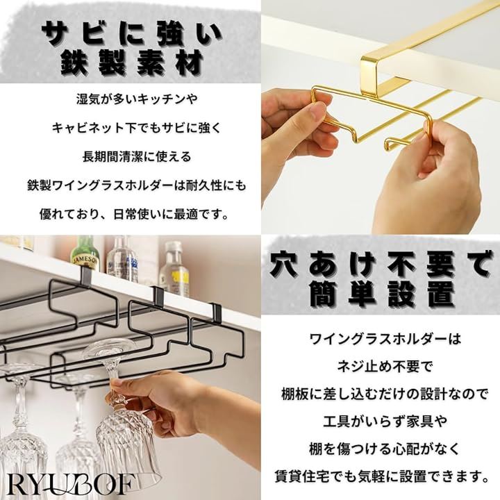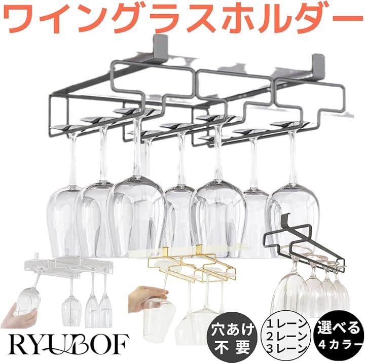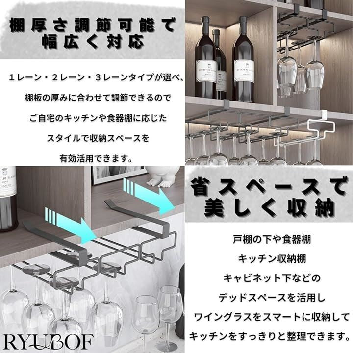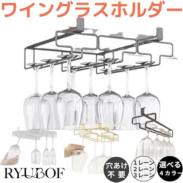 RYUBOF ワイングラスホルダー 吊り下げ 収納 ネジ止め不要 穴あけ不要 棚厚調整可能 吊り戸棚用 |