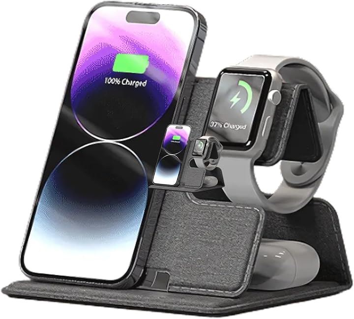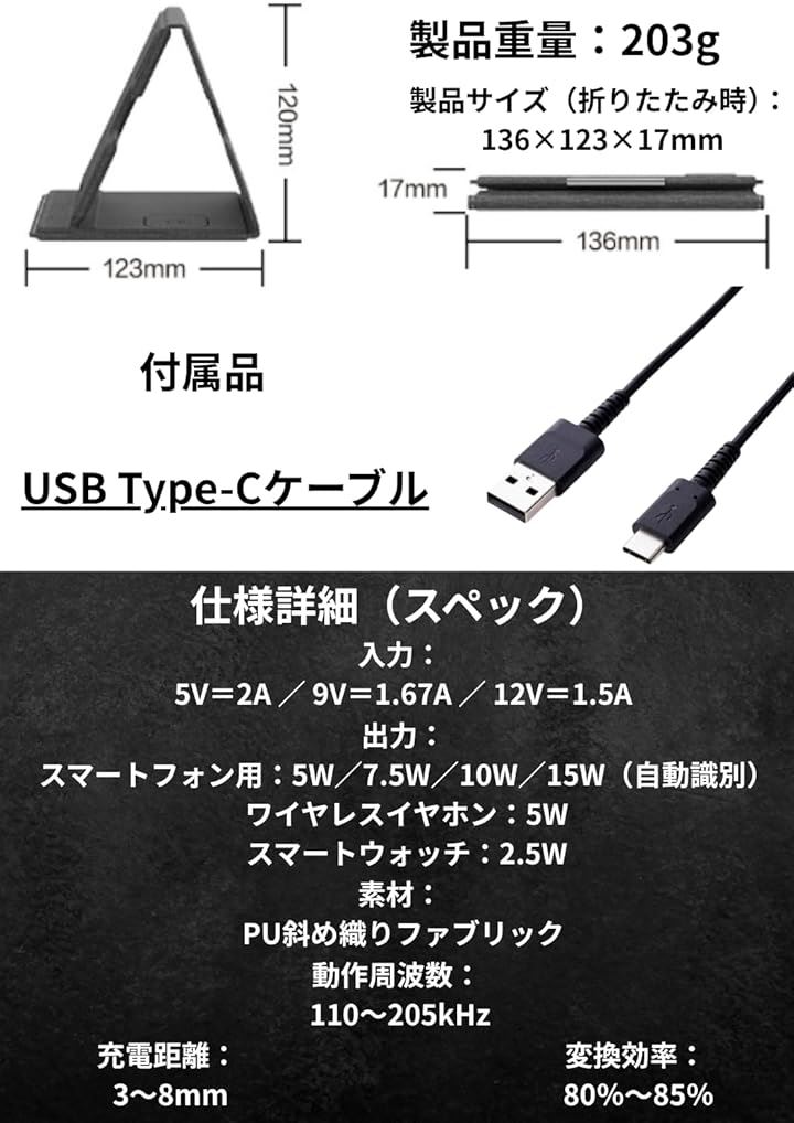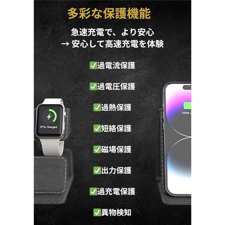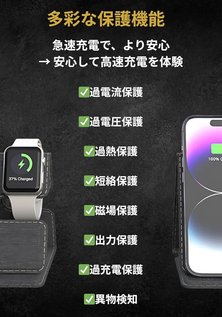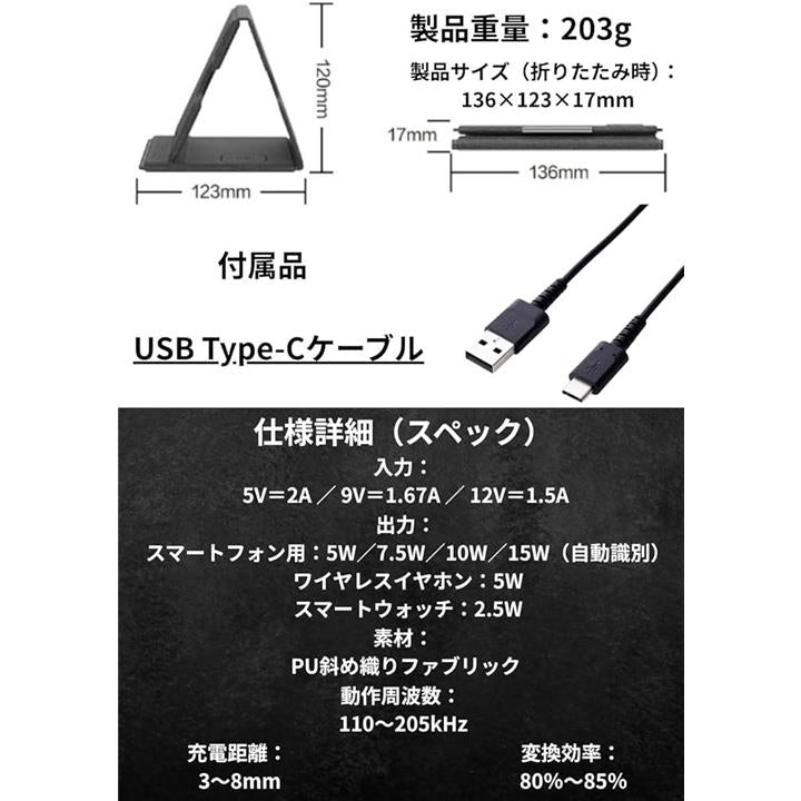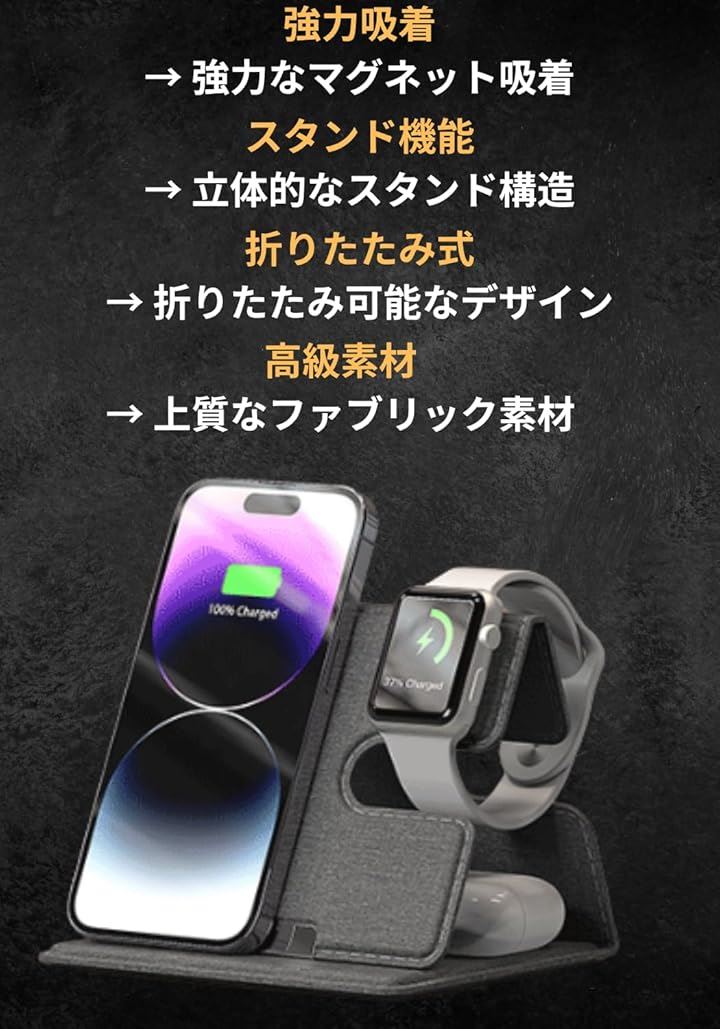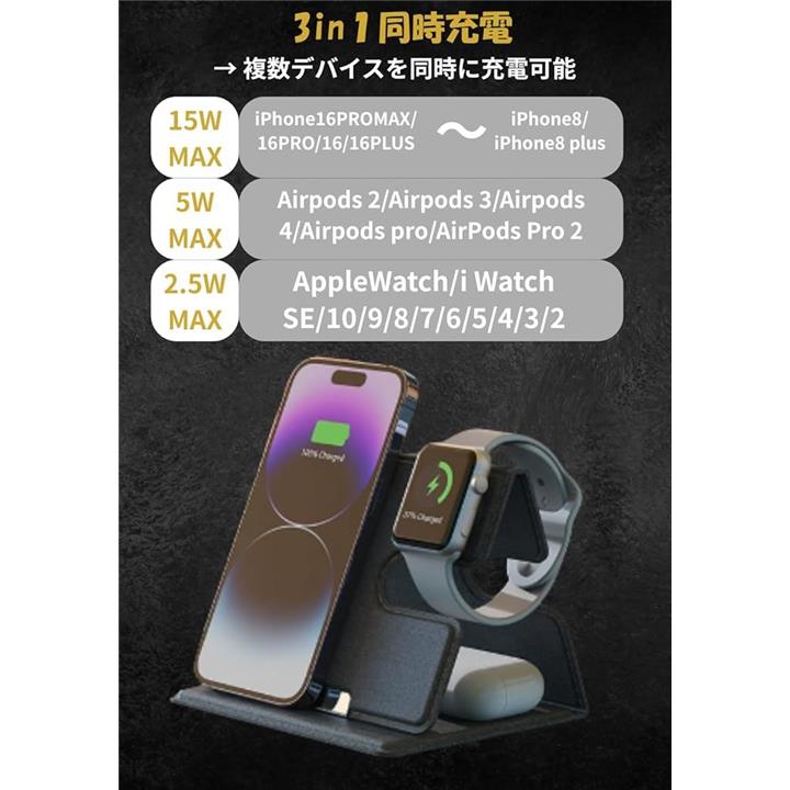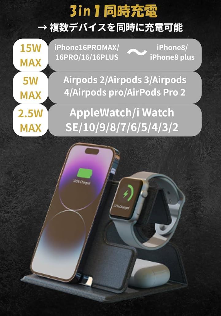 ワイヤレス充電器 3in1 折りたたみ コンパクト 軽量 スタンド 急速 iPhone 16/15/14/13/12 Pro Max Miniシリーズ対応 USB-Cケーブル付き スマホ充電器