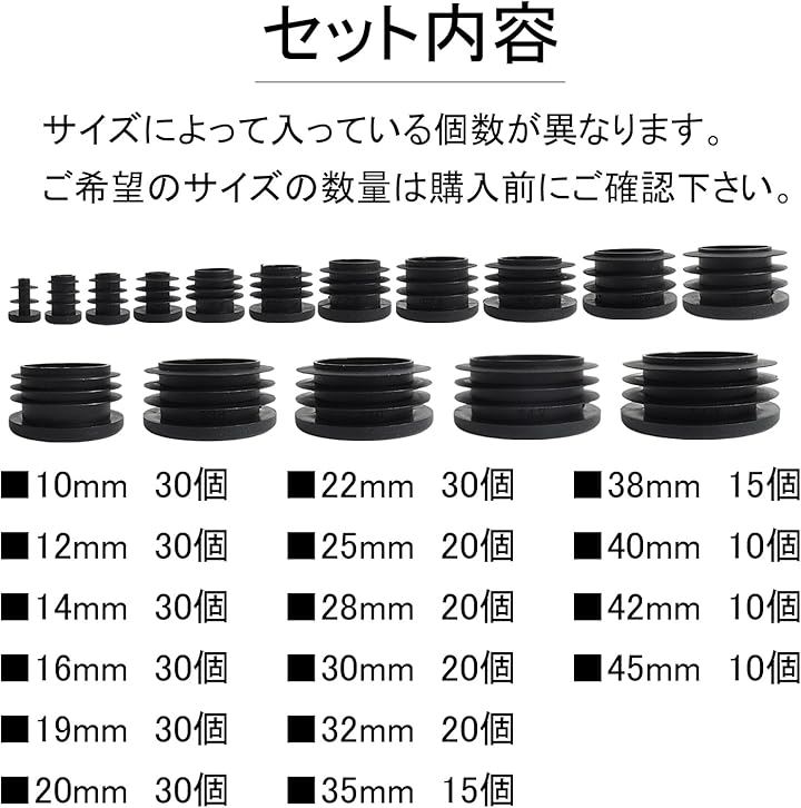 各種パイプに対応する豊富なサイズ展開。 パイプエンドカバーキャップは、(外径/内径)(10mm/9mm)、(12mm/11mm)、(14mm/13mm)、(16mm/15mm)、(19mm/18mm)、(20mm/19mm)、(22mm/21mm)、(25mm/24mm)、(28mm/27mm)、(30mm/29mm)、(32mm/31mm)、(35mm/33.5mm)、(38mm/37mm)、(40mm/39mm)、(42mm/41mm)、(45mm/44mm)と、実に16種類のサイズを取り揃えています。